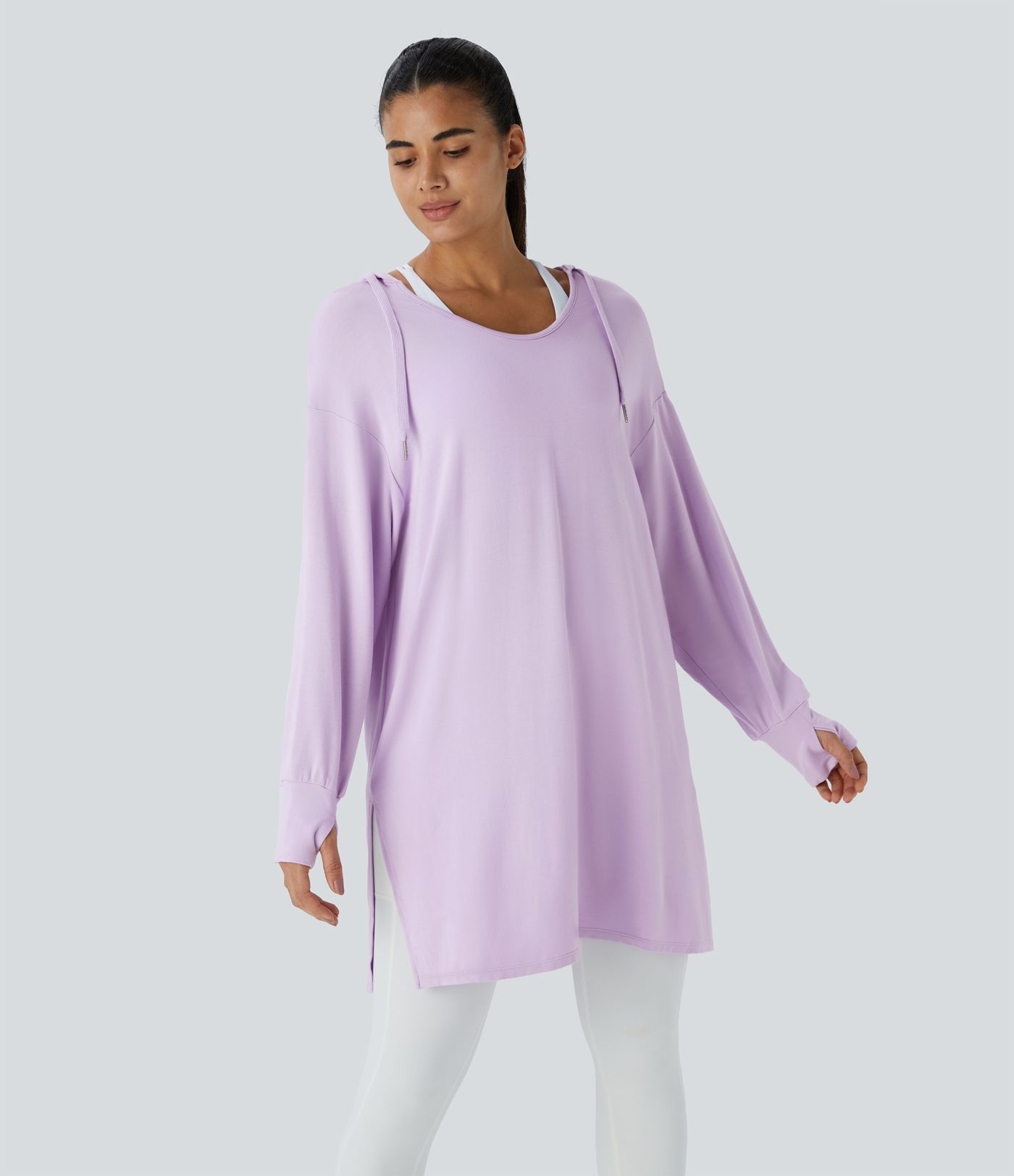 Hooded V Neck Drawstring Thumb Hole Split Longline Casual Sweatshirt
