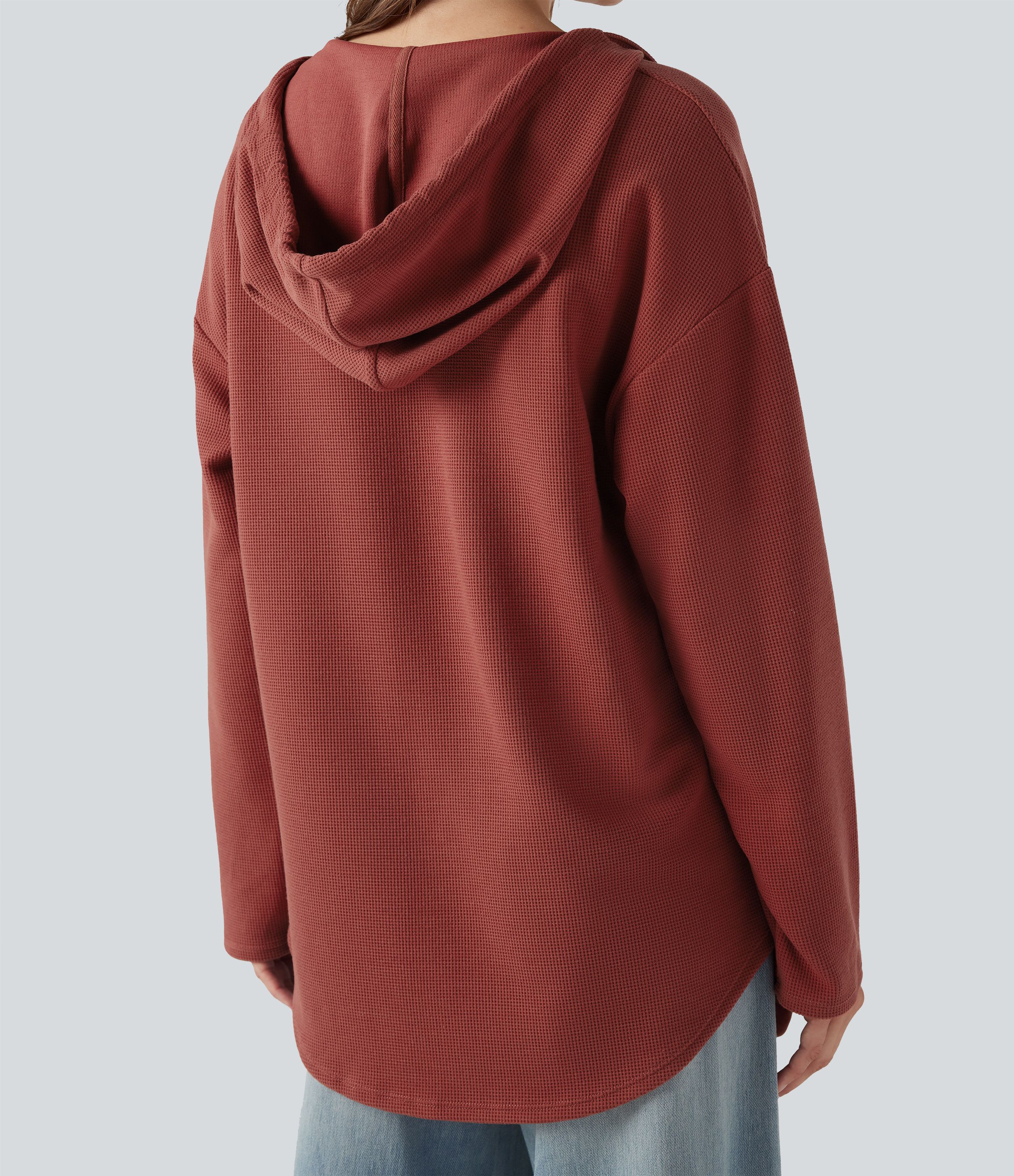 Hooded Drawstring Long Sleeve Curved Hem Waffle Casual Sweatshirt with Pocket