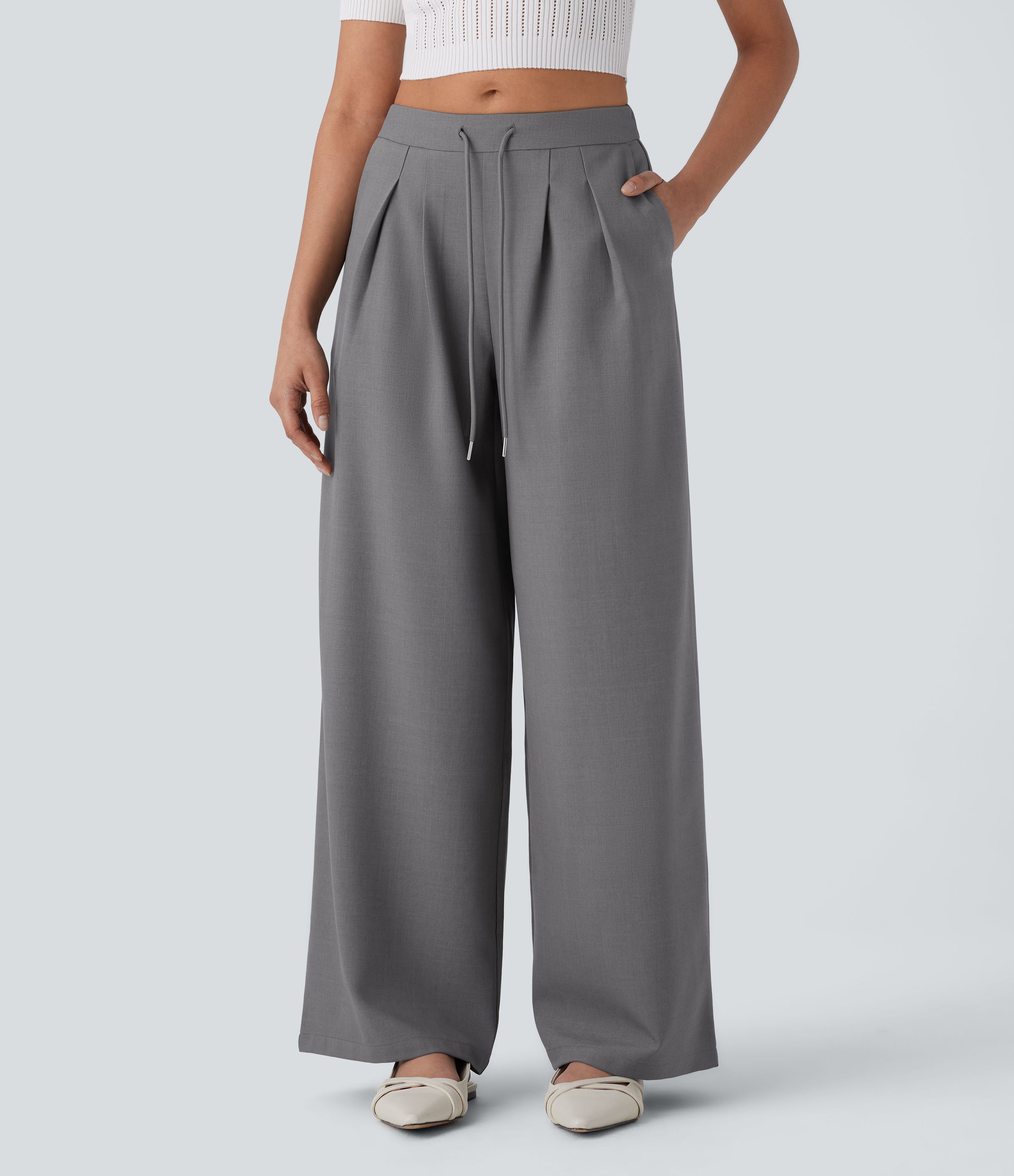 Mid Rise Drawstring Side Pocket Wide Leg Work Trousers
