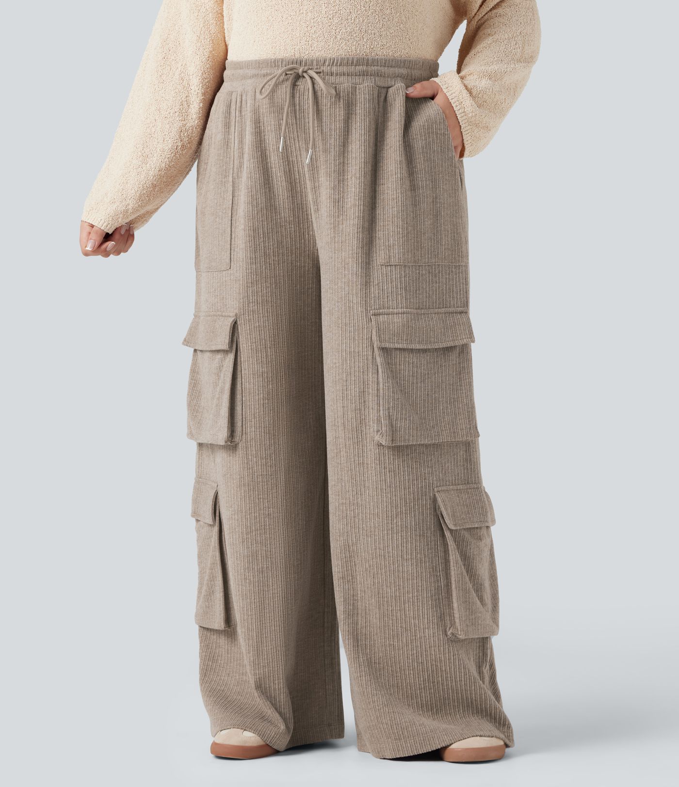 Plus Size Ribbed Mid Rise Drawstring Wide Leg Casual Cargo Trousers with Pockets