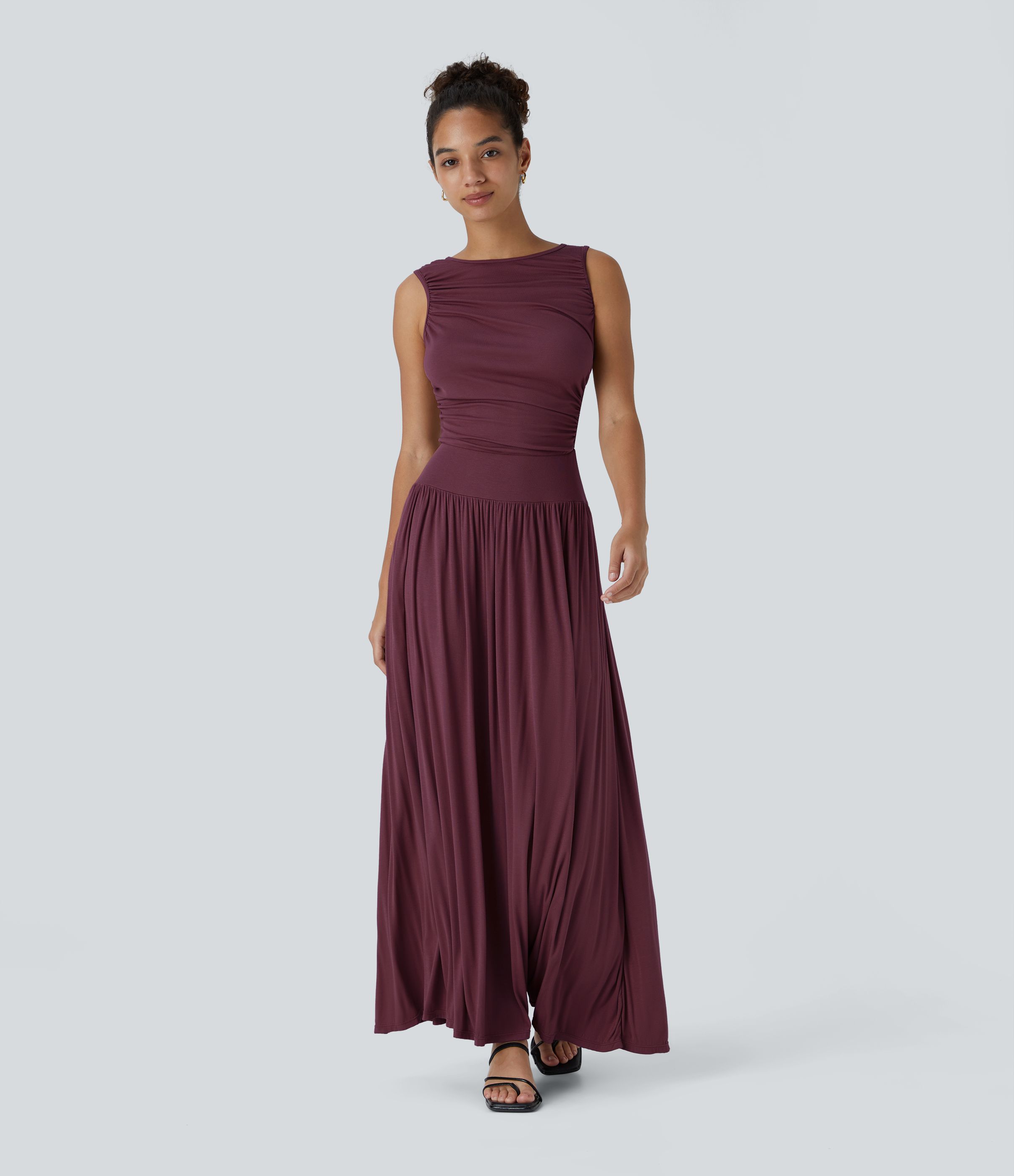 Ribbed Boat Neck Asymmetric Strap Ruched Side Pocket Flowy Maxi Casual Dress