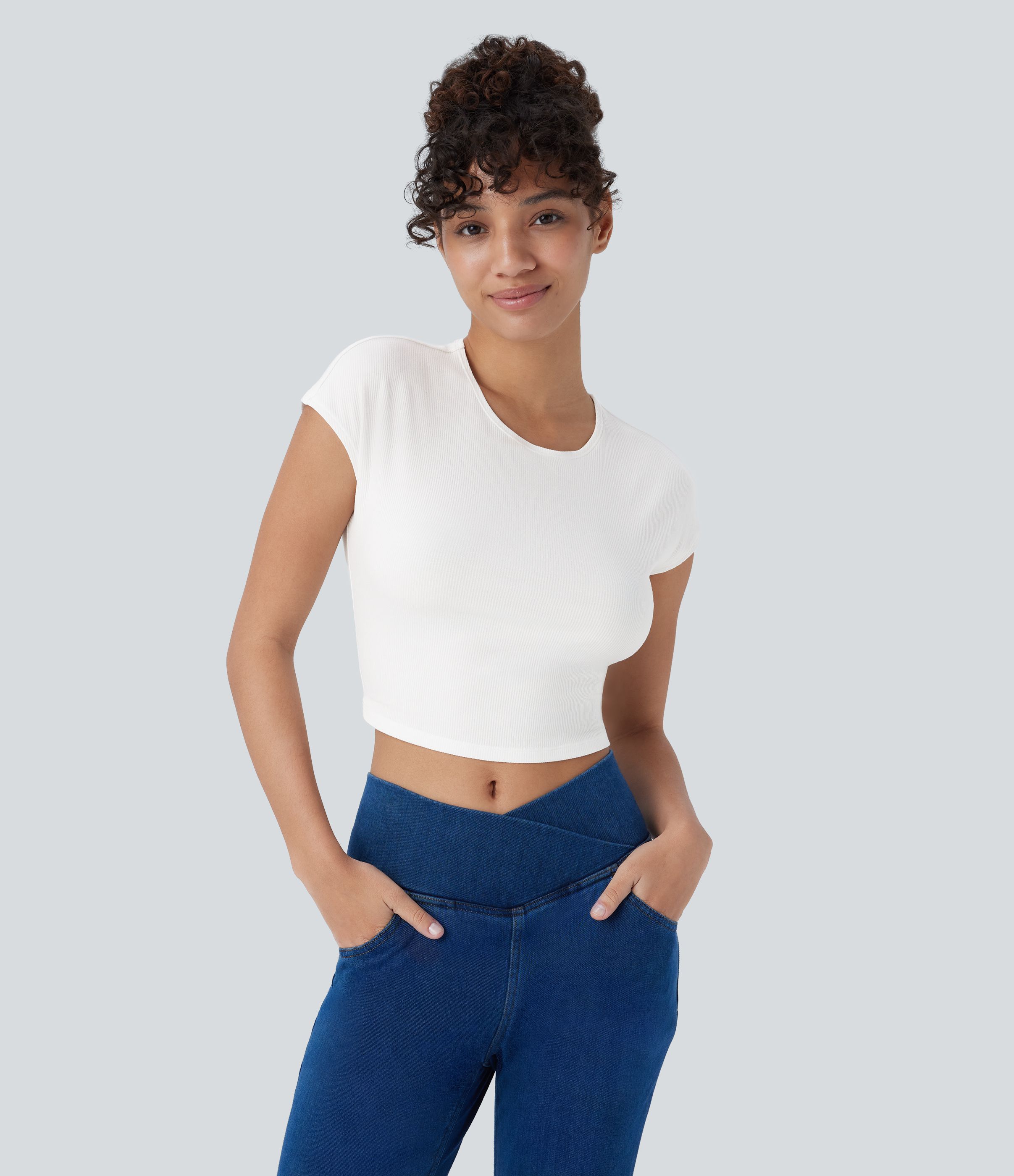 Ribbed Knit Round Neck Short Sleeve Cropped Casual Baby Tee