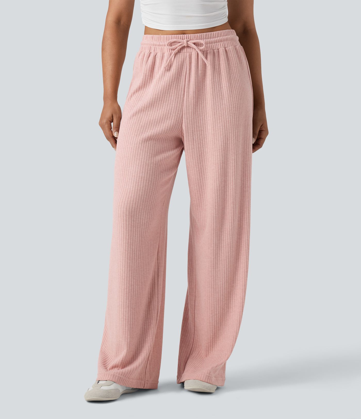 Ribbed Knit High Waisted Drawstring Straight Leg Fleece Casual Trousers with Pockets