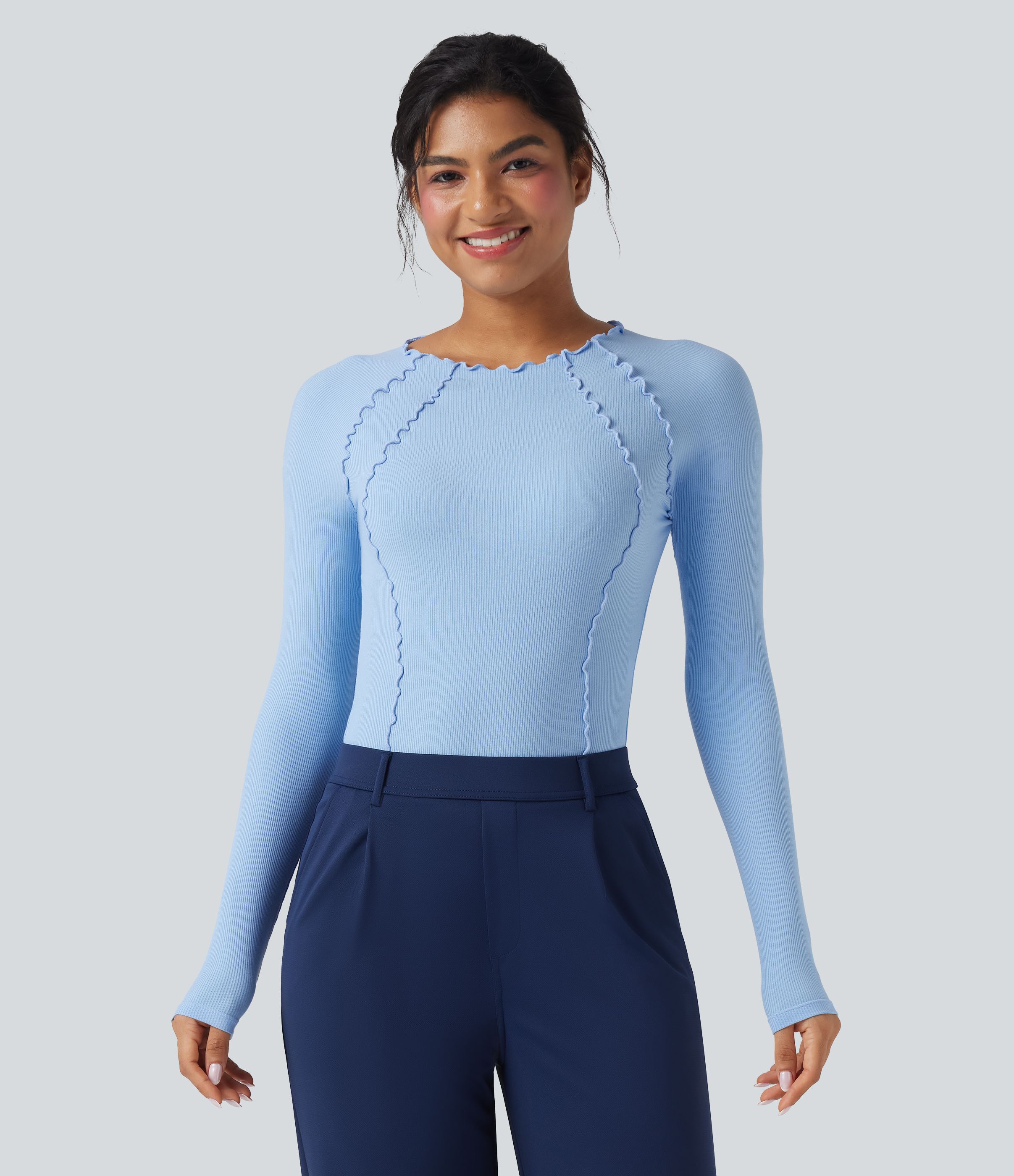 Ribbed Knit Lettuce Trim Round Neck Long Sleeve Work Bodysuit