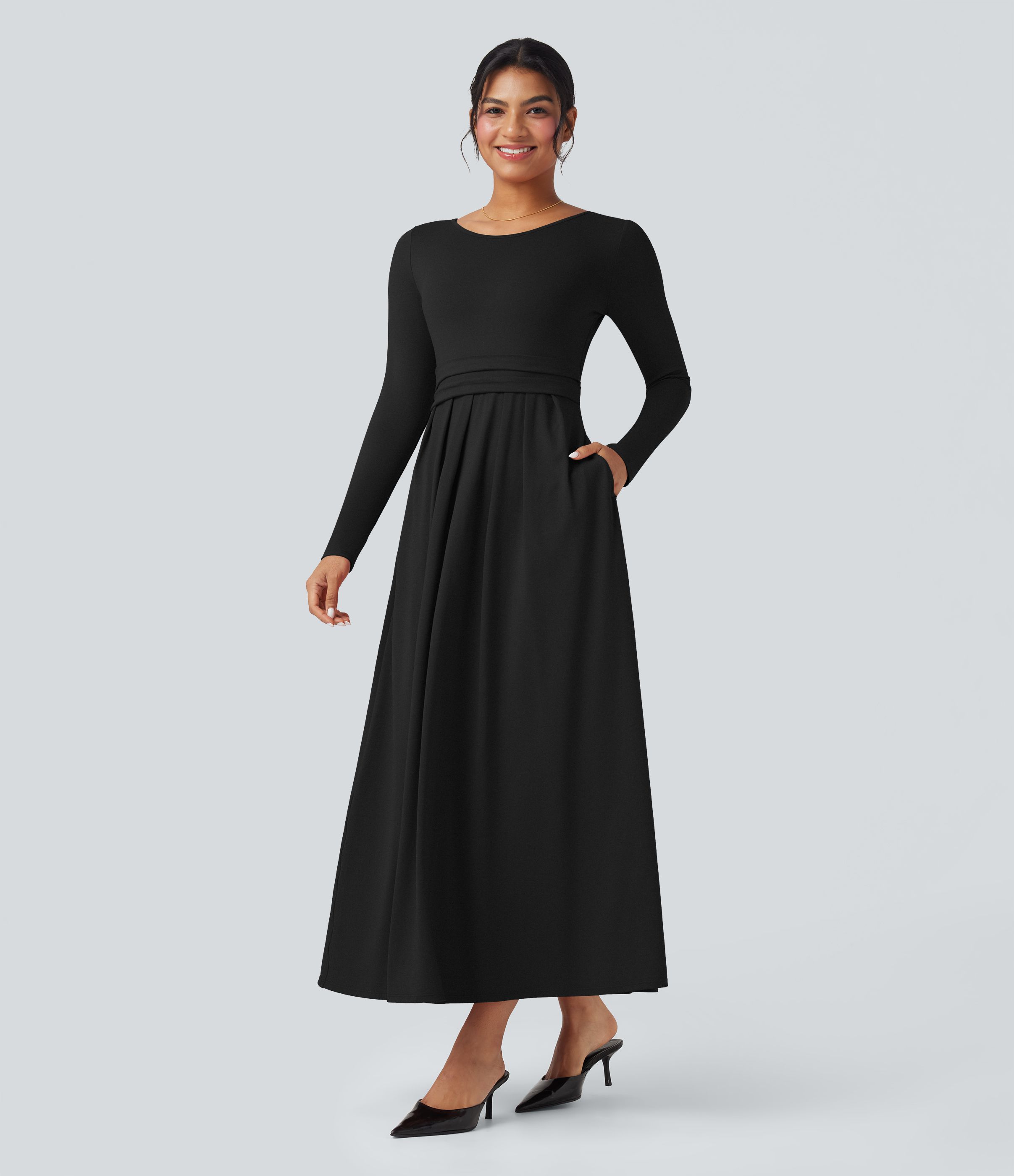 Scoop Neck Long Sleeve Flare Maxi Casual Dress with Pockets