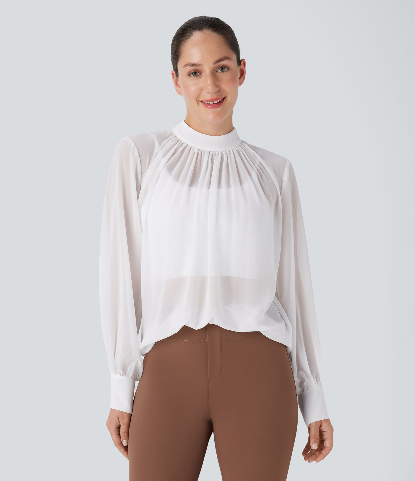 Sheer Stand Collar Button Long Sleeve Work Blouse