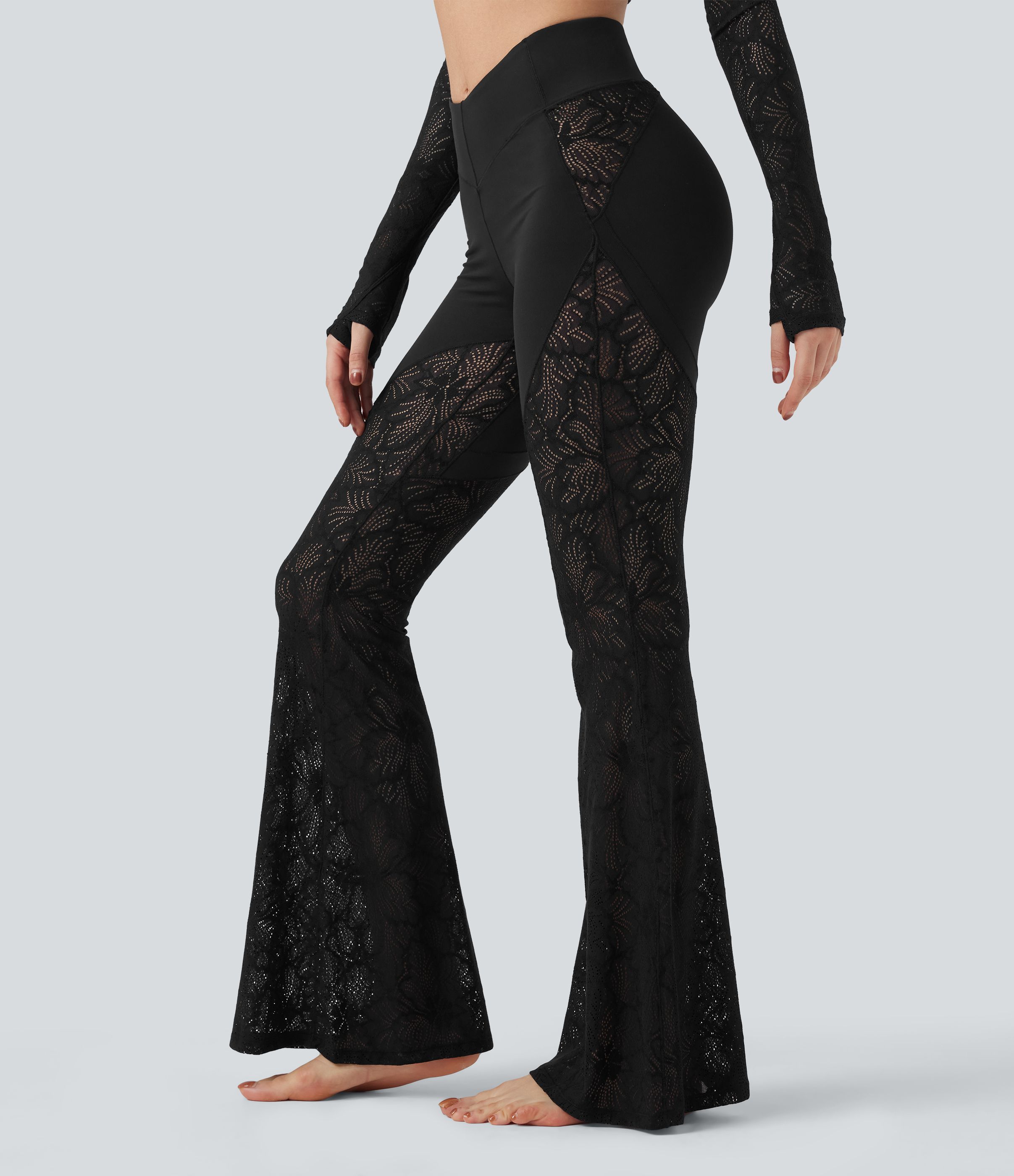 SoftlyZero™ V-Shaped High Waisted Contrast Lace Yoga Super Flare Leggings with Pocket