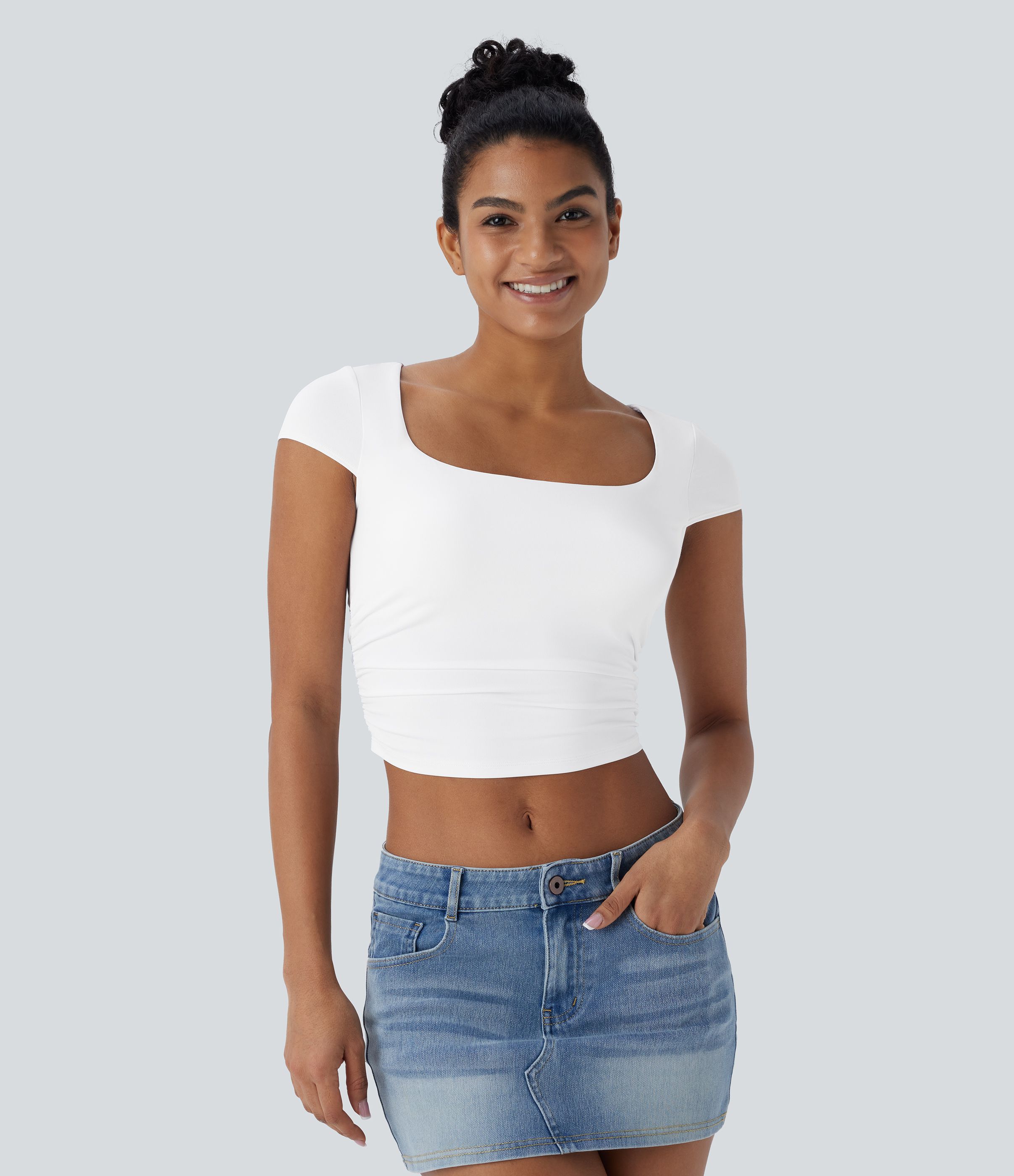 Square Neck Cap Sleeve Ruched Skinny Cropped Casual Baby Tee