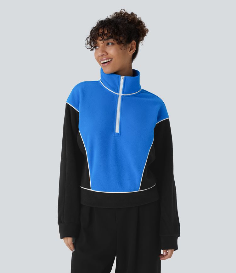 Stand Collar Half Zip Long Sleeve Colour Block Fleece Casual Sweatshirt