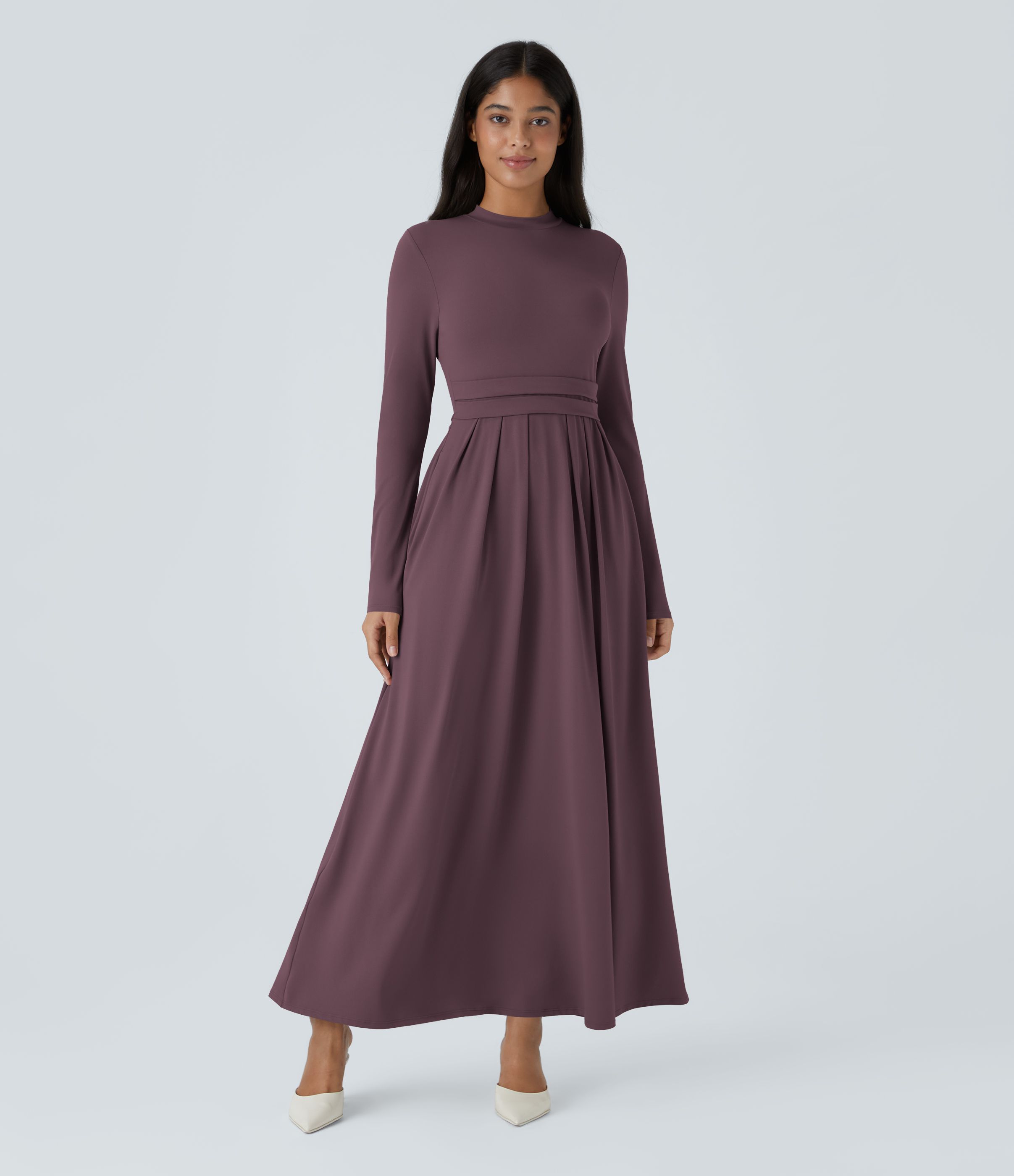 Mock-neck Long Sleeve Pocket Flare Maxi Casual Dress