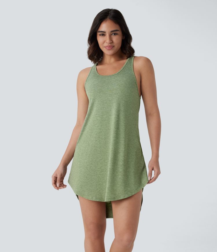 U Neck Backless Racerback Side Pocket High Low Curved Hem Mini Resort Dress