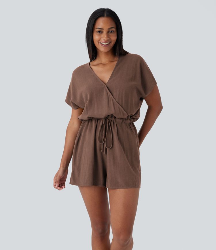 V-Ausschnitt Überkreuz Kurzarm Kordelzug Taschen Leinen-Mix Lässiger Einteiler