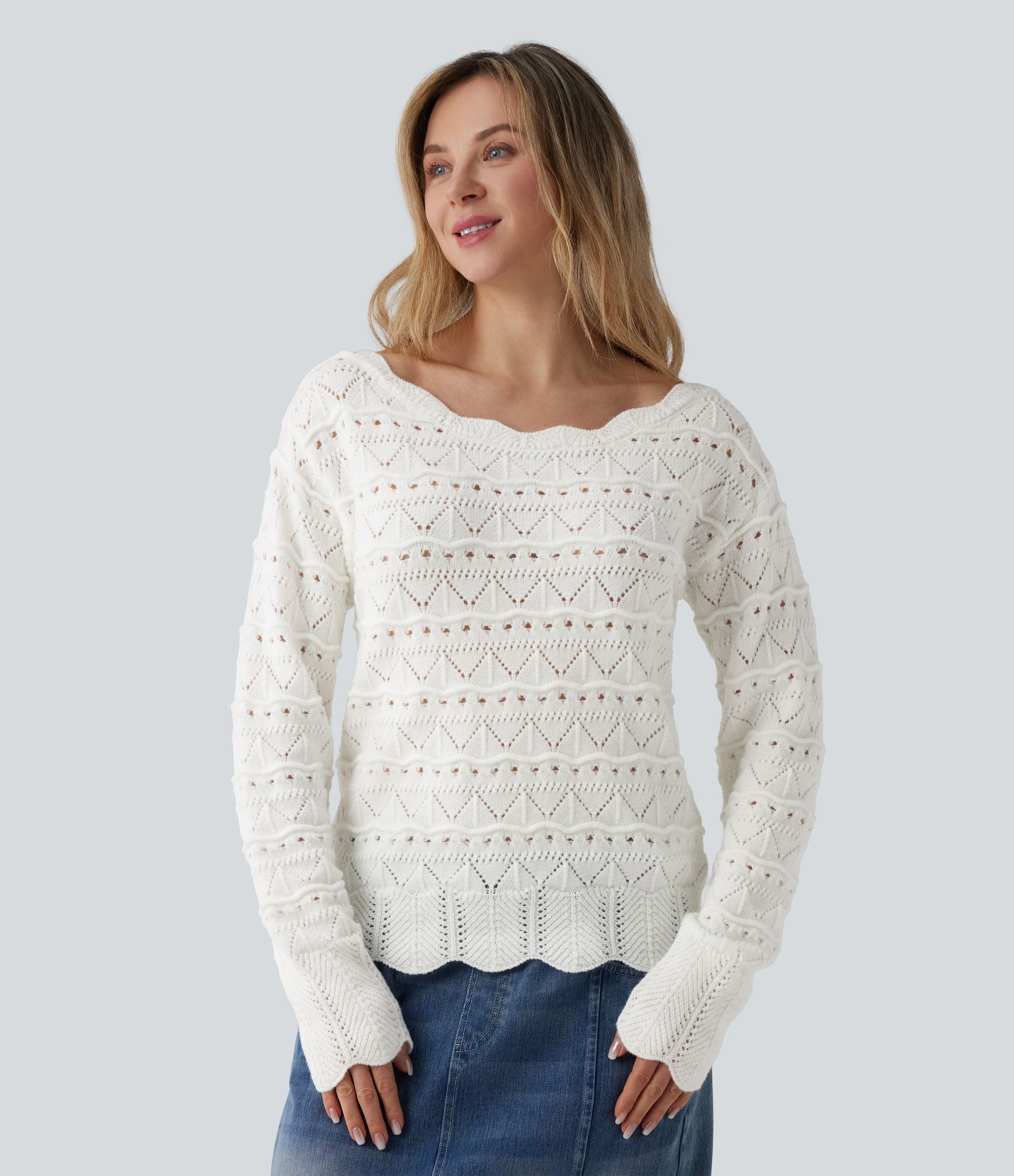 Boat Neck Long Sleeve Open Knit Casual Jumper