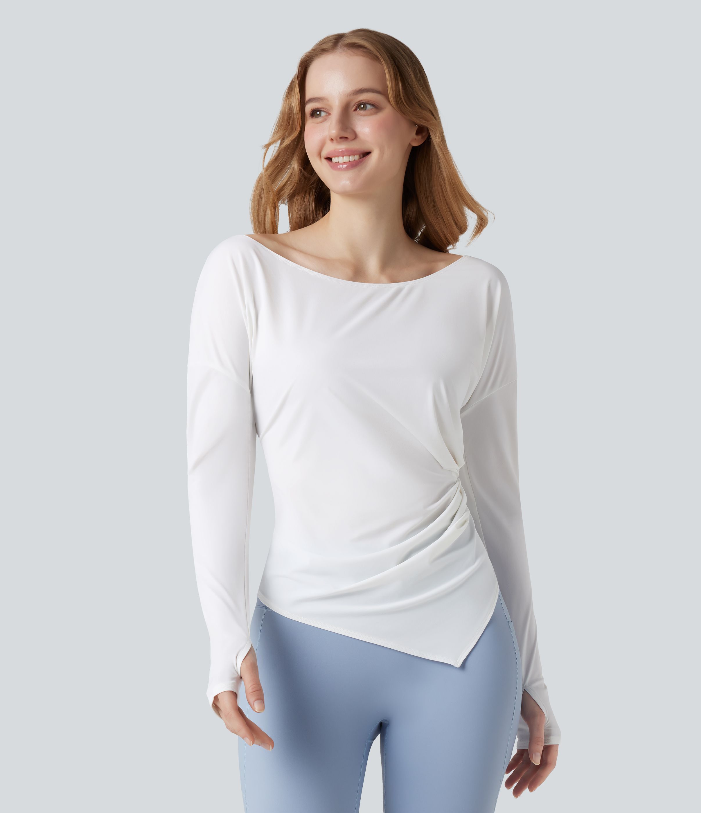 Boat Neck Long Sleeve Thumb Holes Ruched Asymmetric Hem Quick Dry Yoga Sports Top