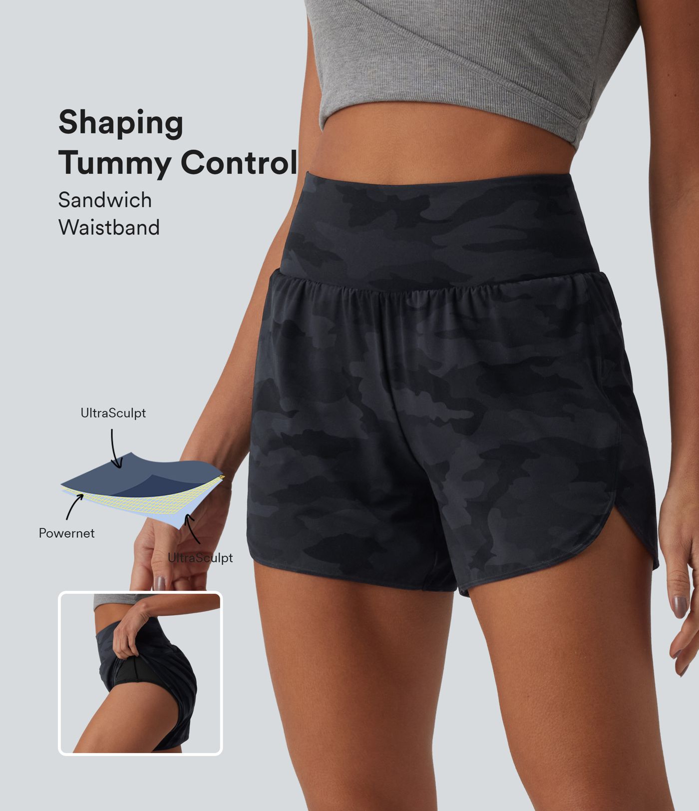Halara UltraSculpt™ Camo Print High Waisted Tummy Control Curved Hem 2-in-1 Running Shorts with Pocket