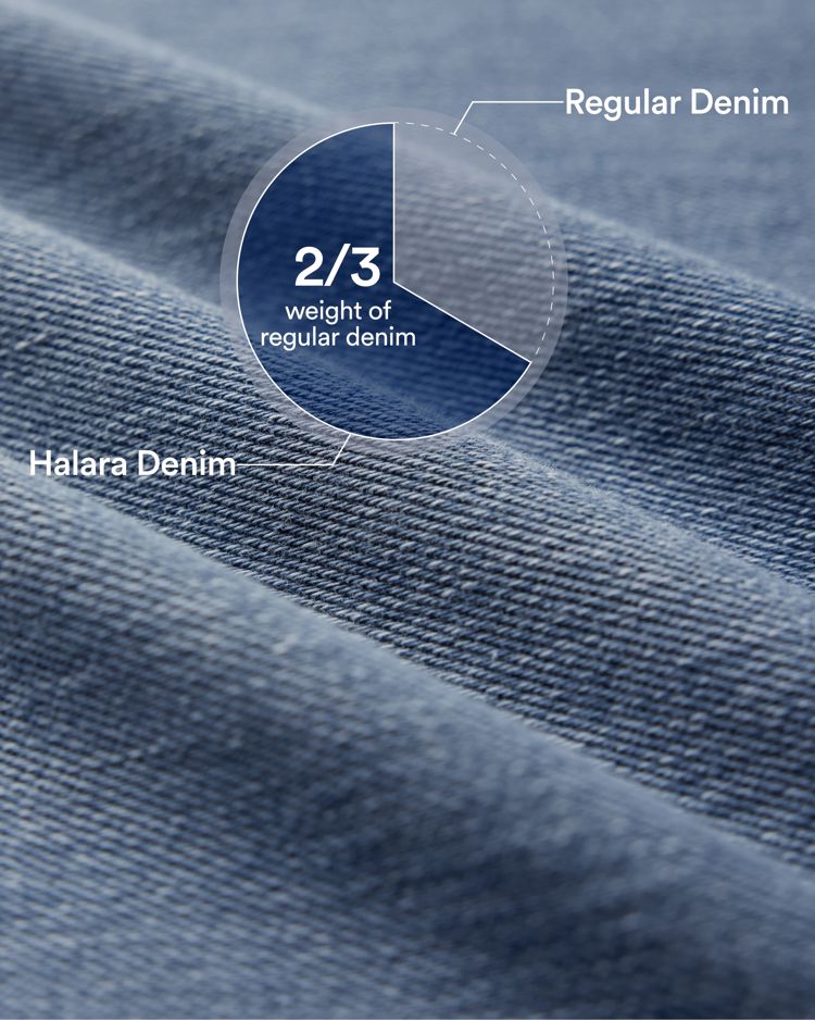 Weighing just 2/3 of traditional denim—about the same as an iPhone—this denim is so light, it feels almost weightless.