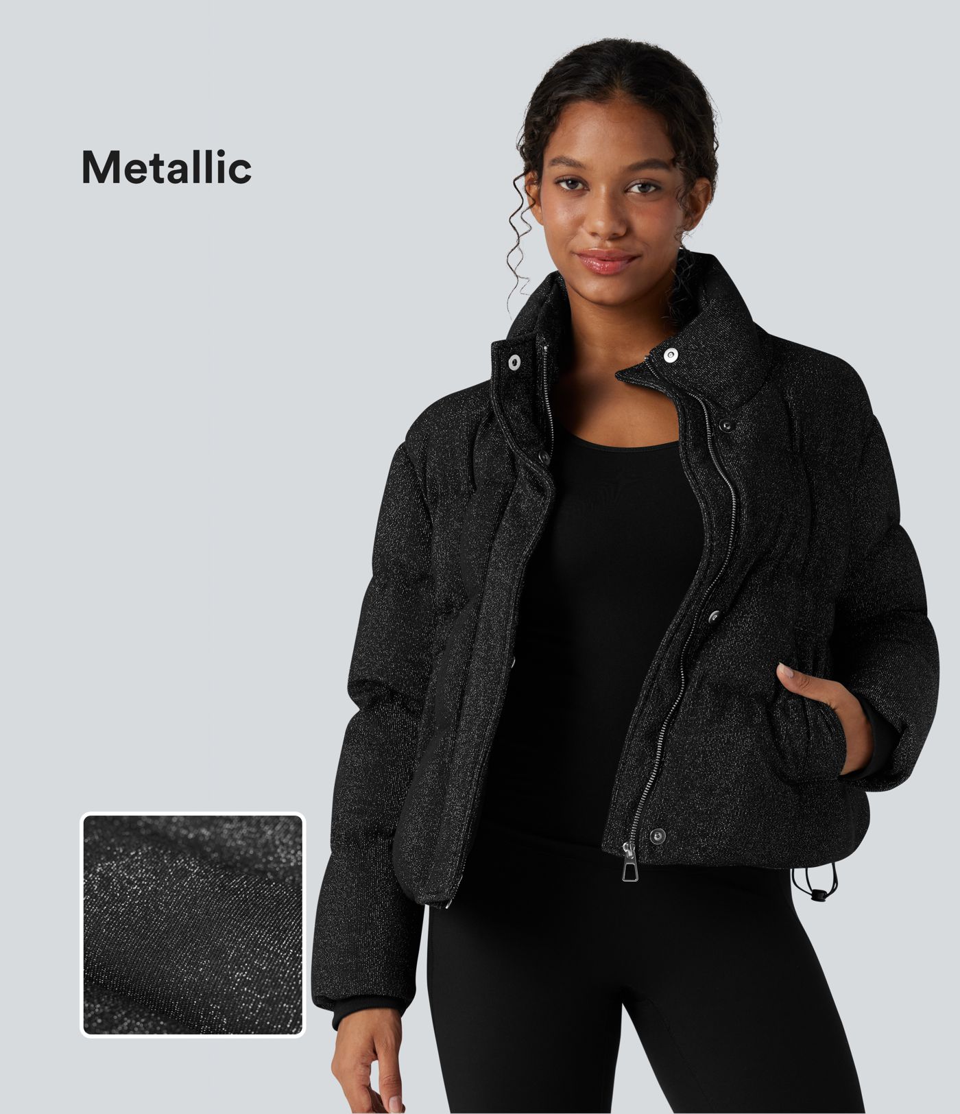 High Neck Drawstring Hem Metallic Casual Padded Jacket with Pockets