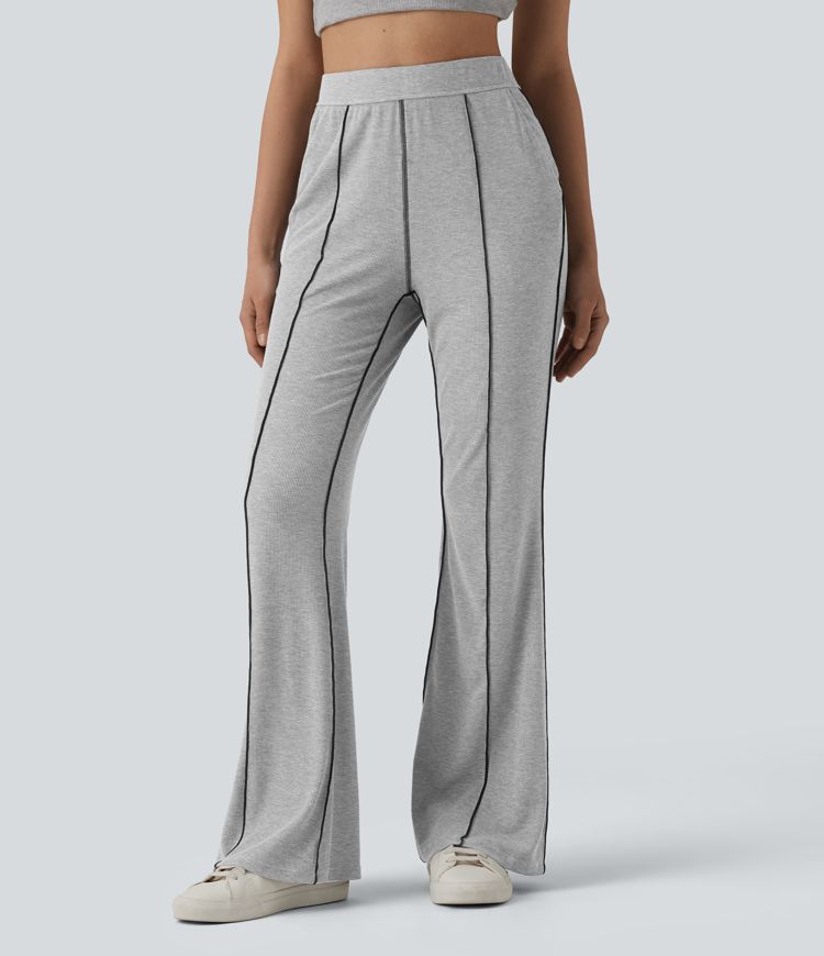 High Stretch Ribbed Knit High Waisted Color Block Top-stitching Casual Flare Leggings with Pockets