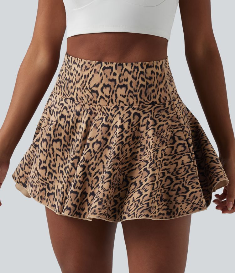 High Waisted 2-in-1 Leopard Print A-line Mini Tennis Skirt with Pockets