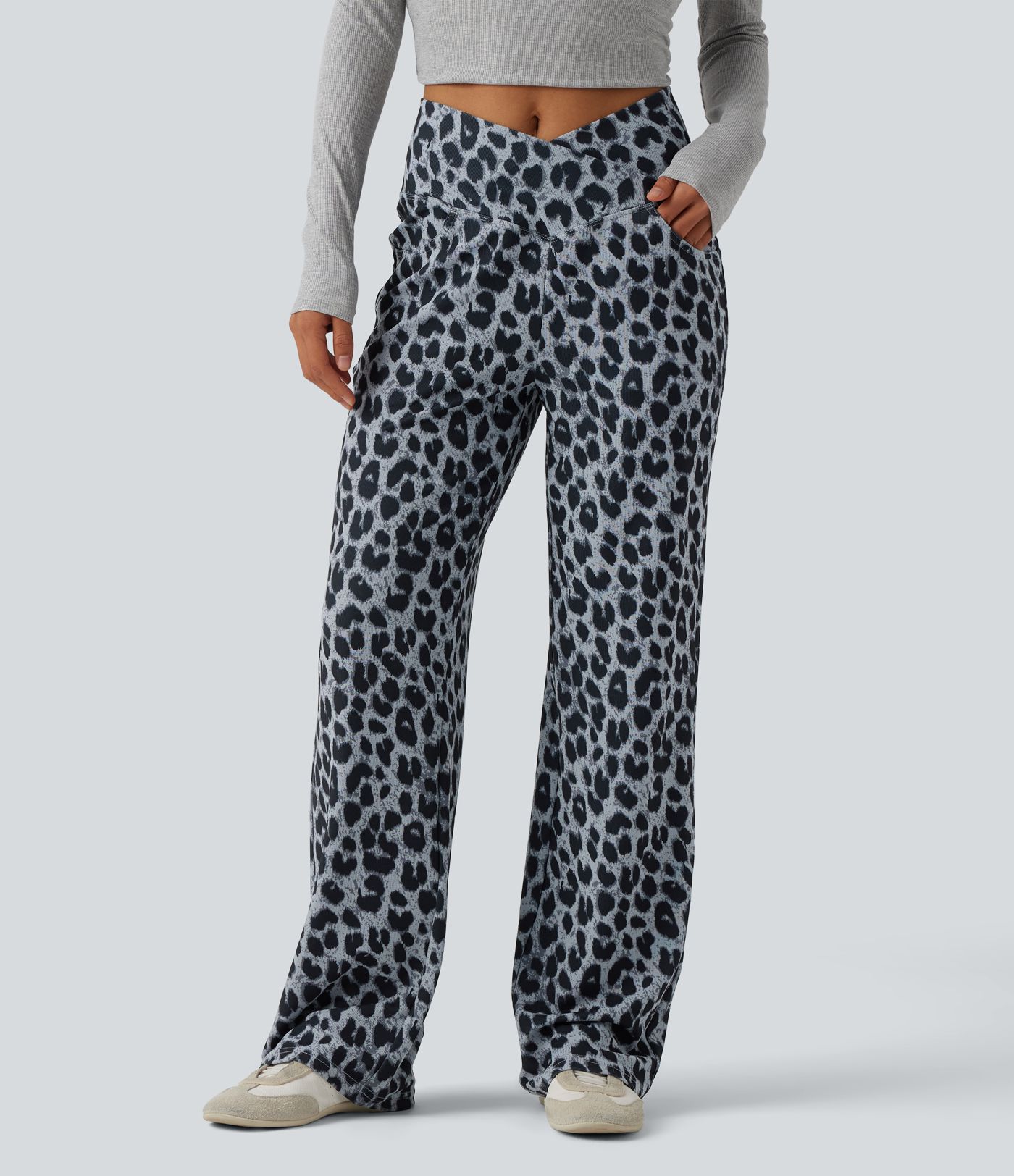 High Waisted Crossover Wide Leg Leopard Print Waffle Casual Trousers with Pockets