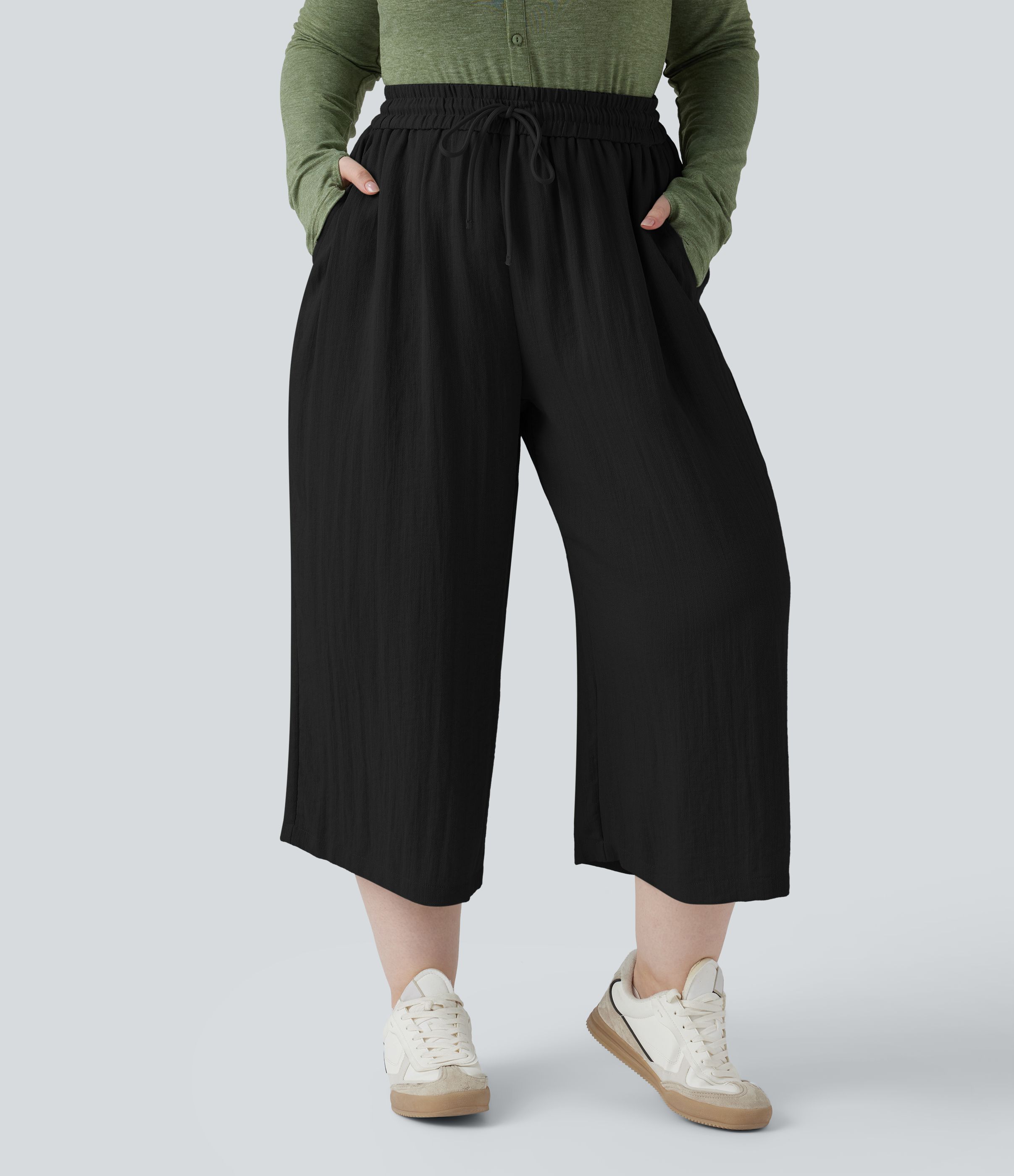 High Waisted Drawstring Wide Leg Cropped Casual Linen-Feel Plus Size Trousers with Pockets