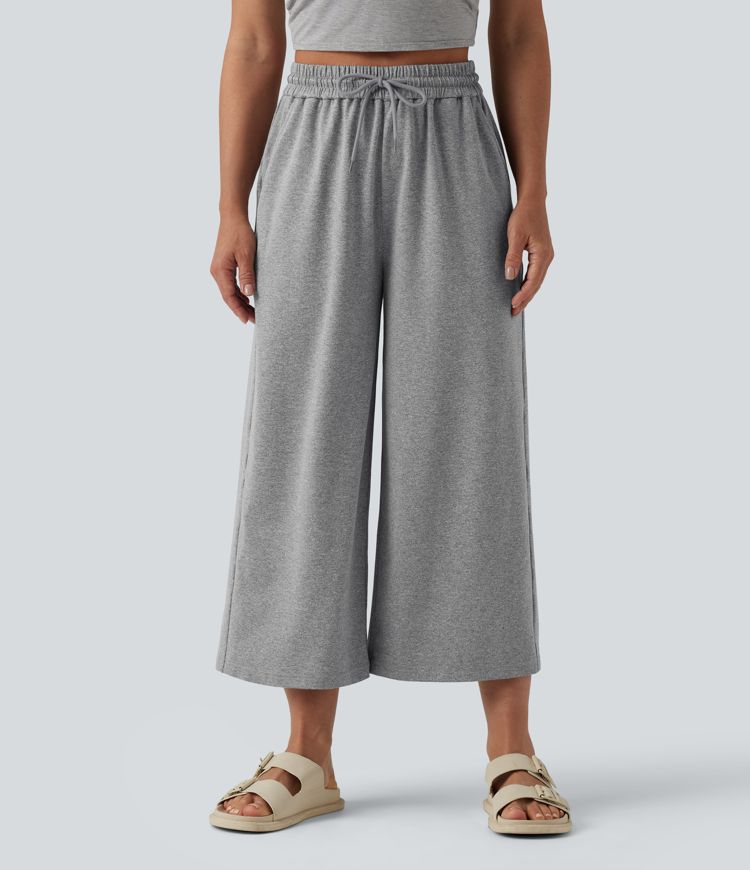 High Waisted Drawstring Wide Leg Cropped Casual Trousers with Pockets