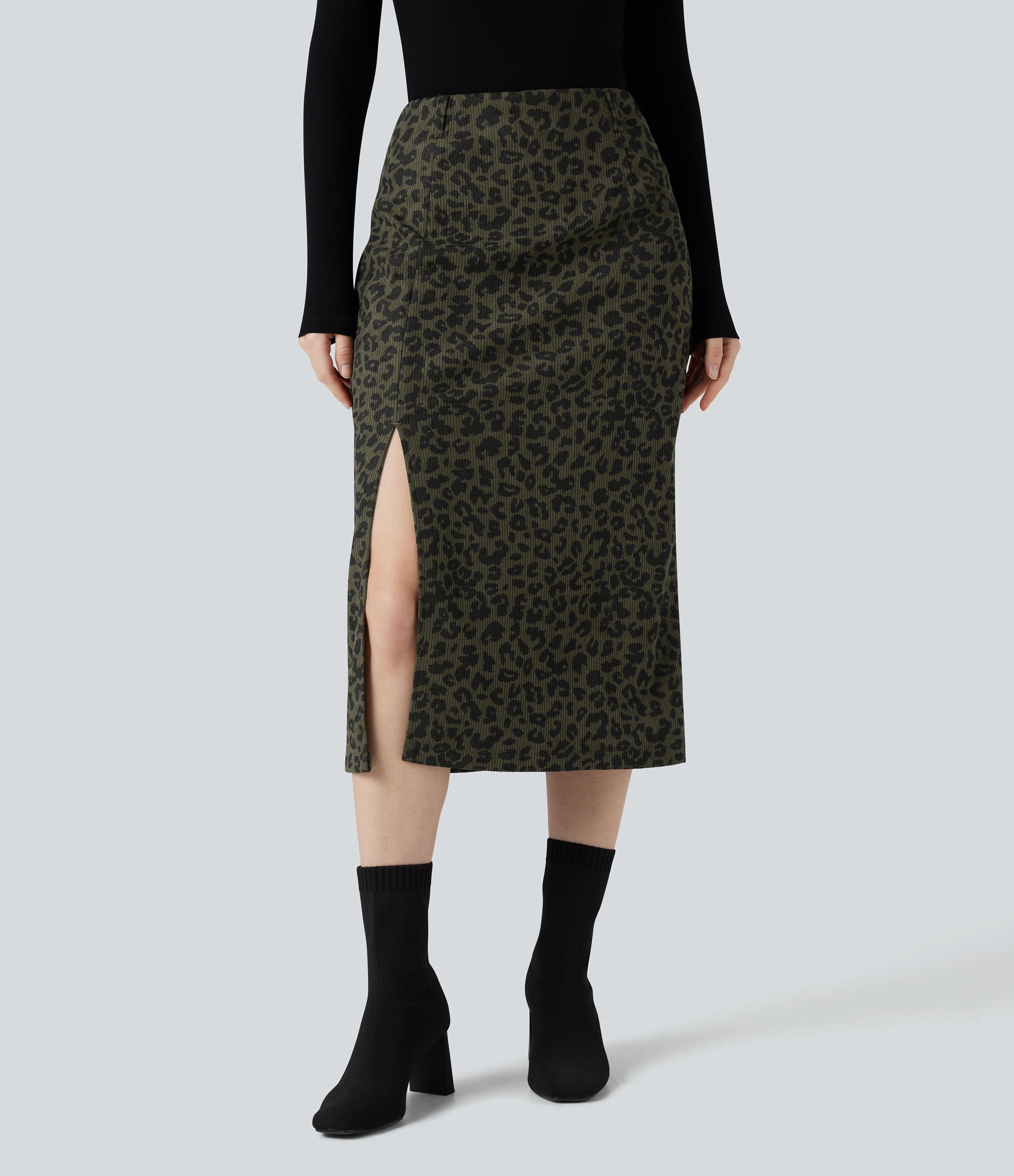 High Waisted Split Hem Midi Leopard Print Corduroy Casual Pencil Skirt