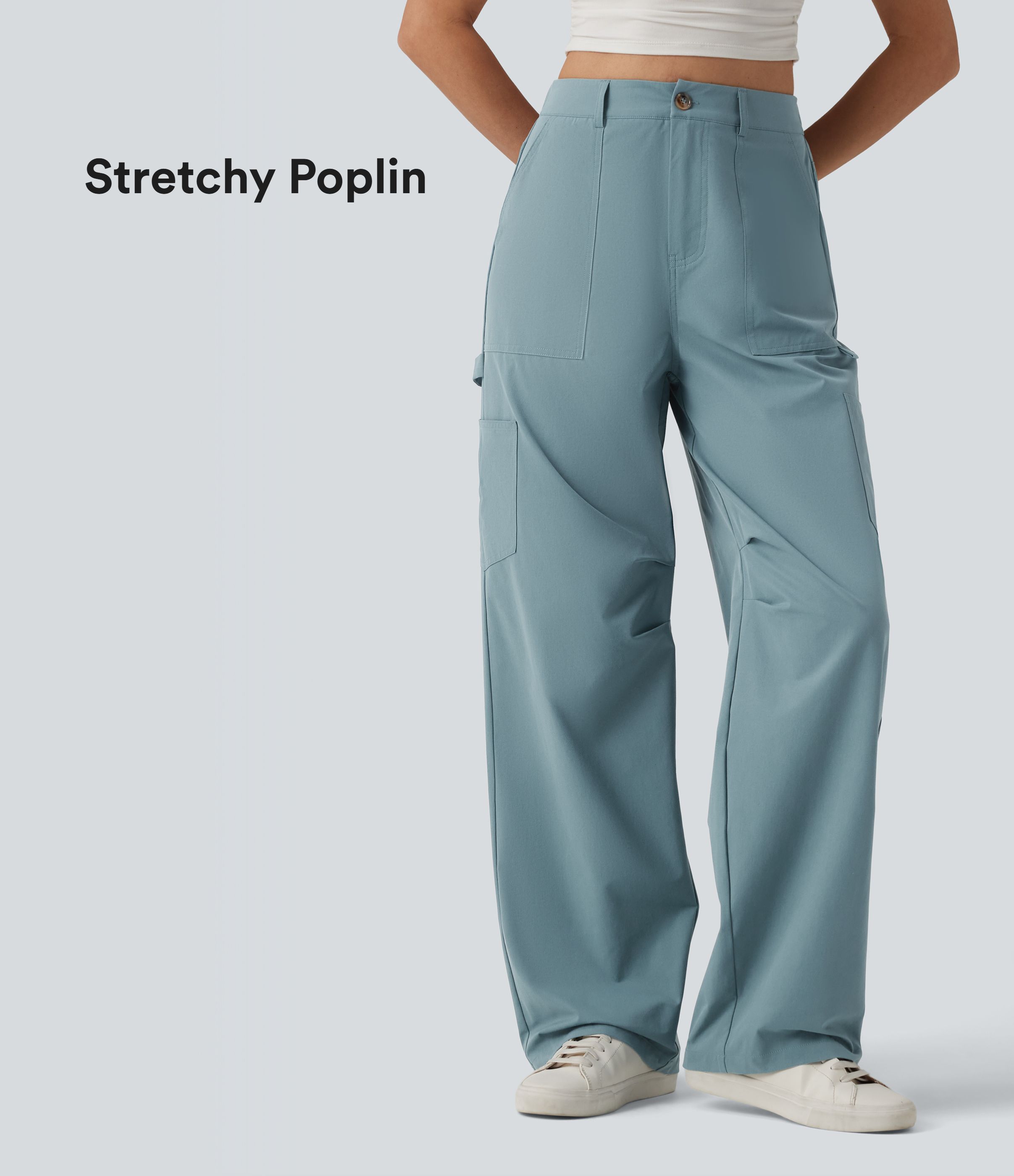 High Waisted Straight Leg Stretchy Poplin Casual Cargo Trousers with Pockets
