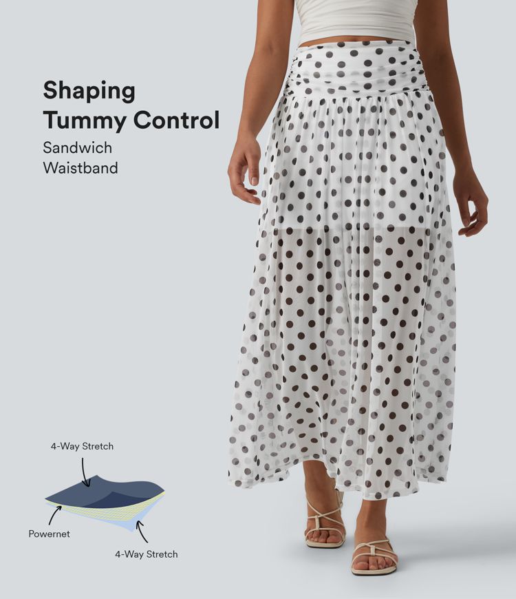 High Waisted Tummy Control Polka Dot Mesh Flowy Maxi Casual Skirt with Pockets
