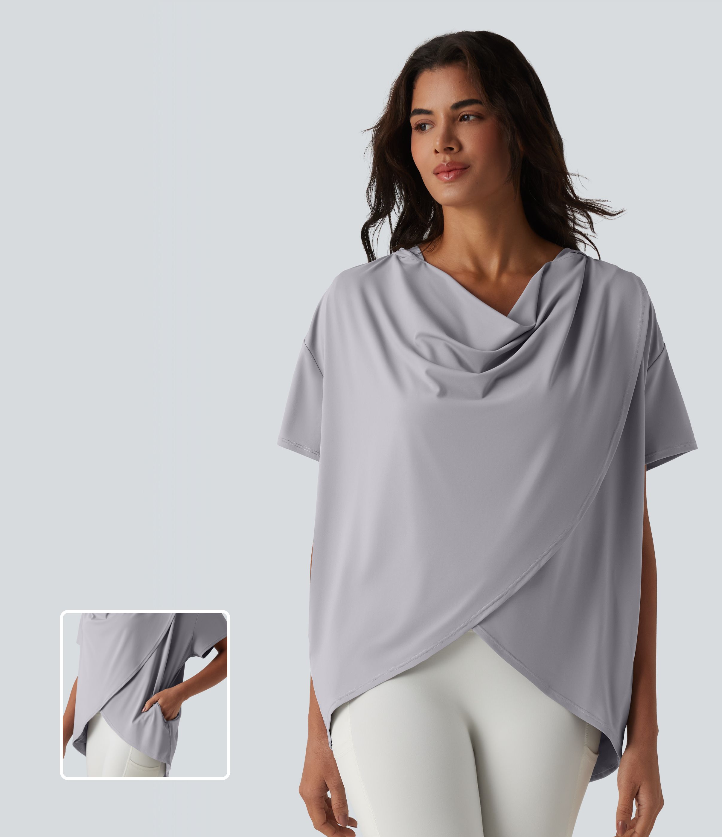 Hooded Cowl Neck Short Sleeve Yoga Sports Top with Pockets