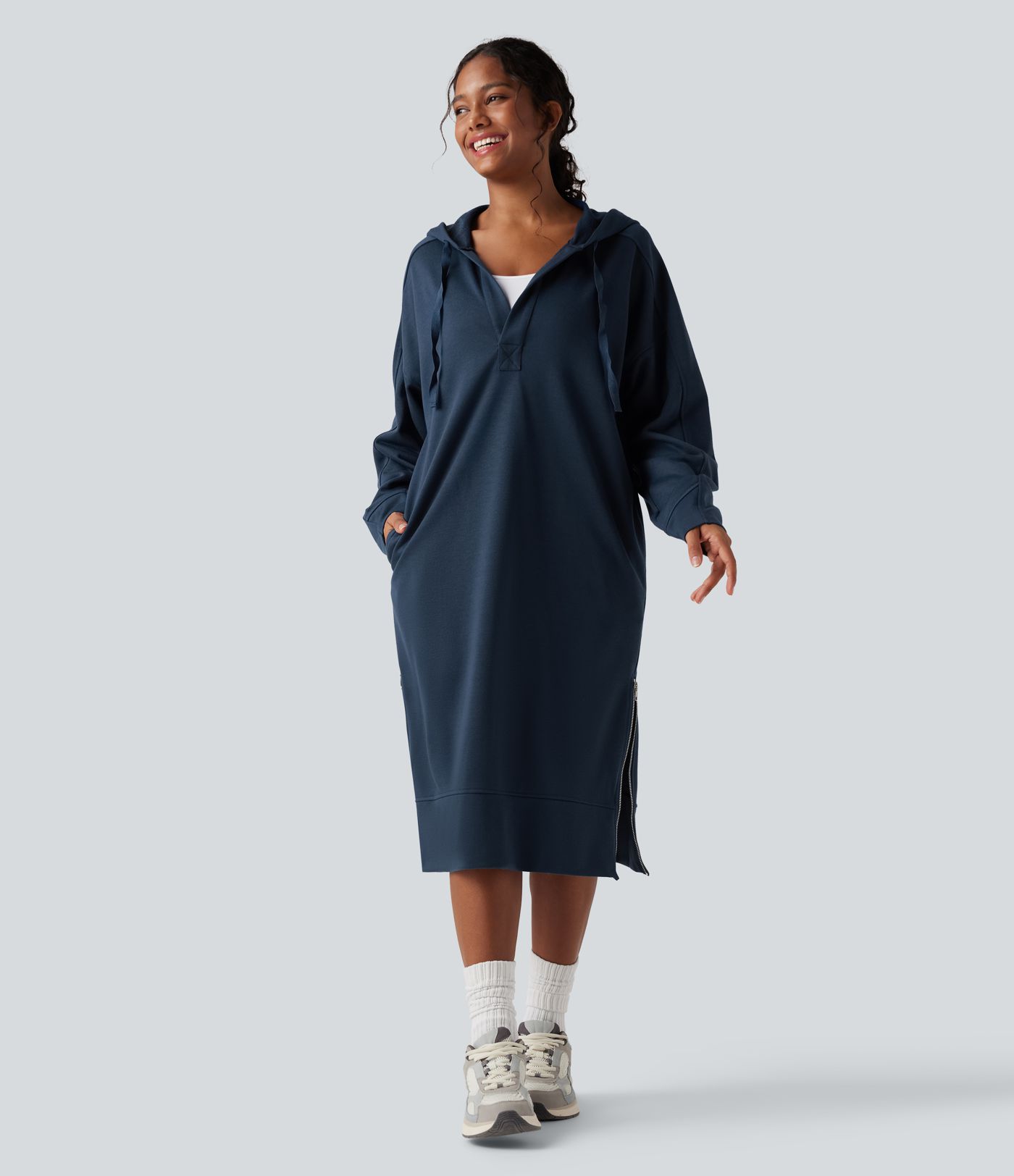 Hooded Drawstring Long Sleeve Zipper Hem Midi Casual Sweatshirt Dress with Pockets