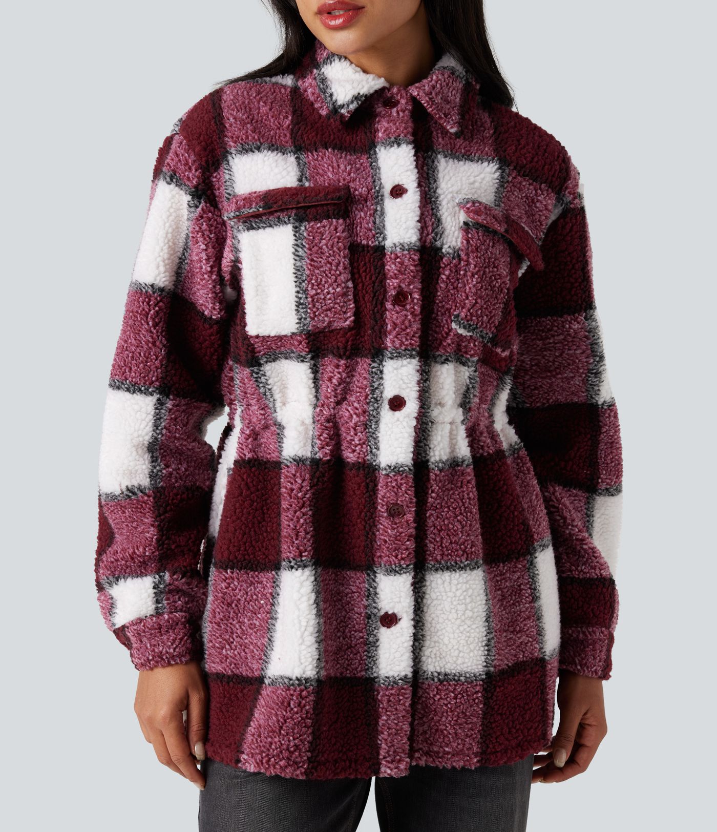 Long Sleeve Inner Drawstring Plaid Casual Sherpa Jacket with Pockets