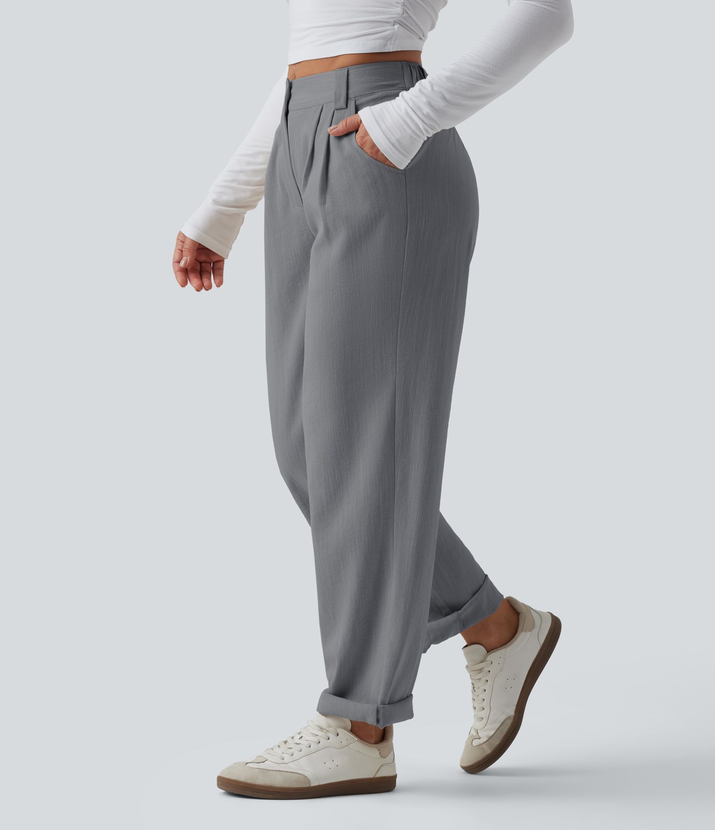 Mid Rise Casual Linen-Feel Trousers with Pockets
