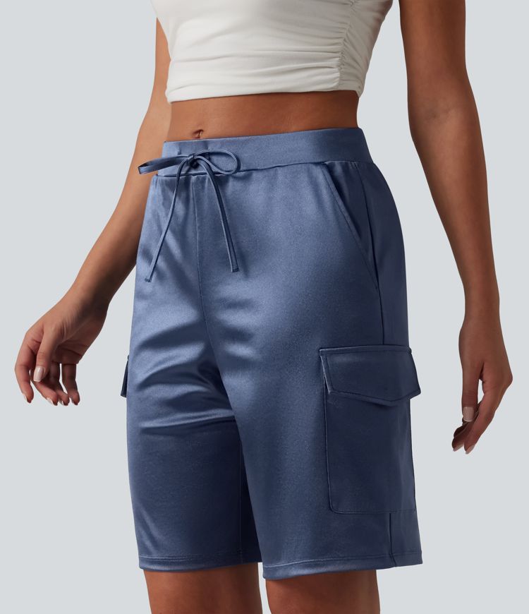 Mid Rise Drawstring Satin Casual Cargo Shorts 9'' with Pockets