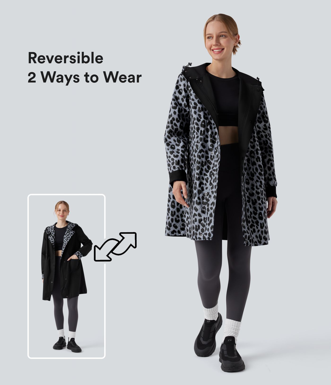 Reversible Hooded Long Sleeve Leopard Print Longline Hiking Jacket with Pockets (Two Looks in One)