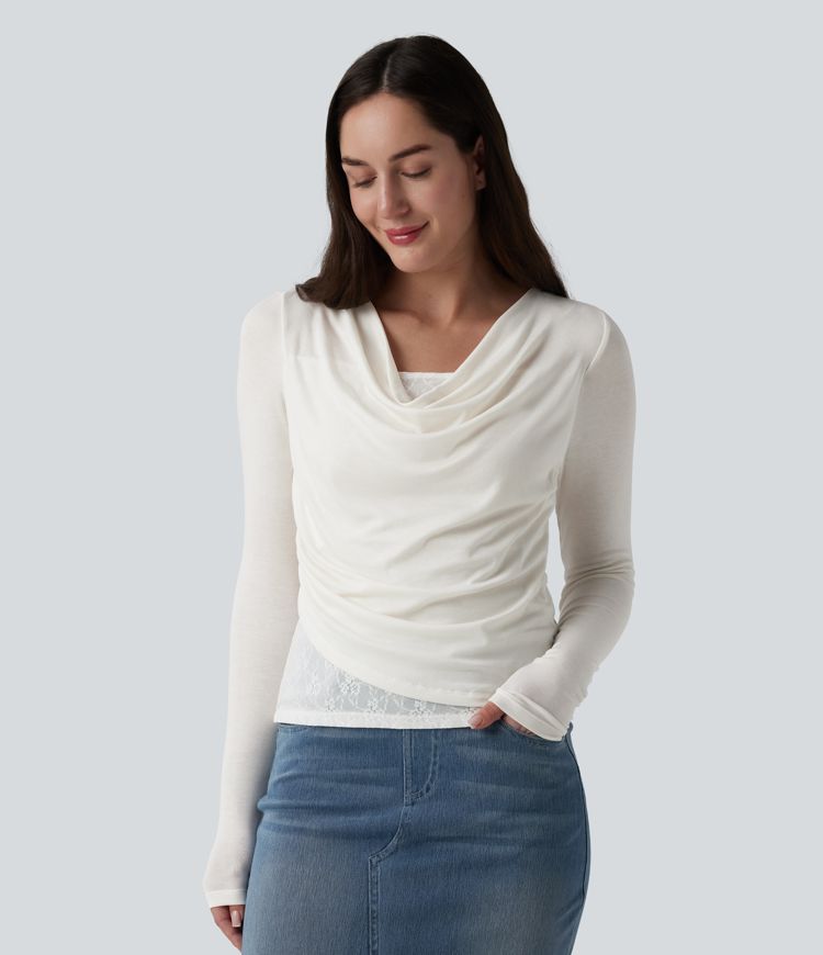 Ribbed Knit Cowl Neck Long Sleeve Contrast Lace Casual Top