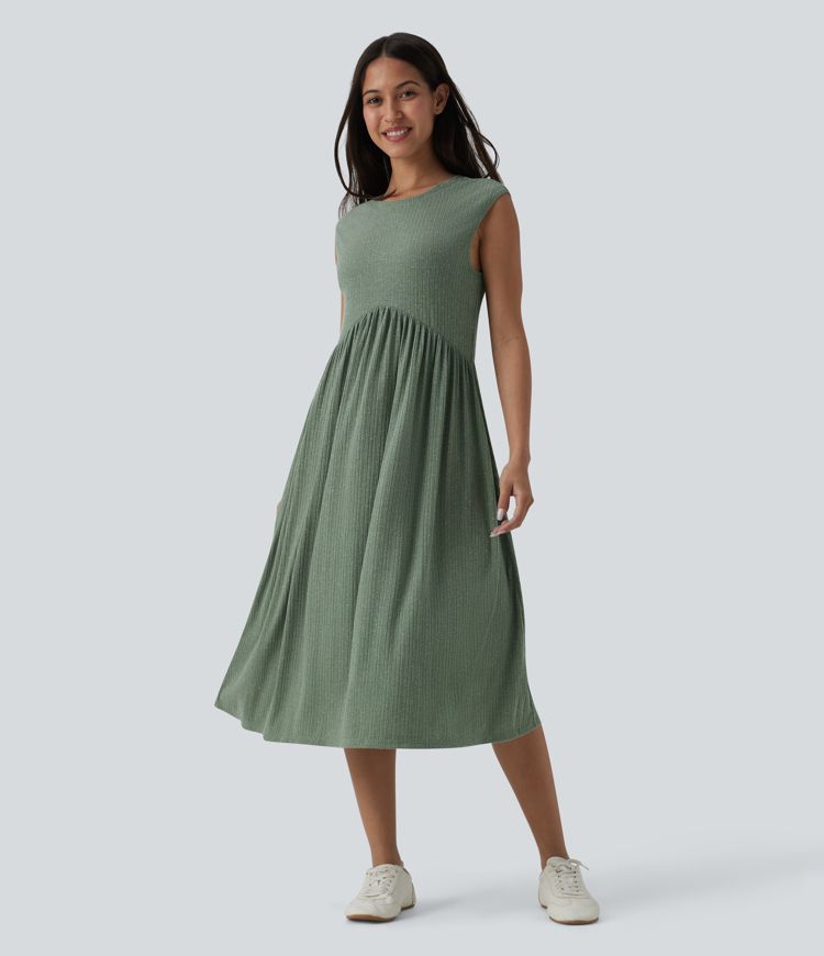 Ribbed Knit Round Neck Sleeveless Flowy Midi Casual Linen-Blend Dress