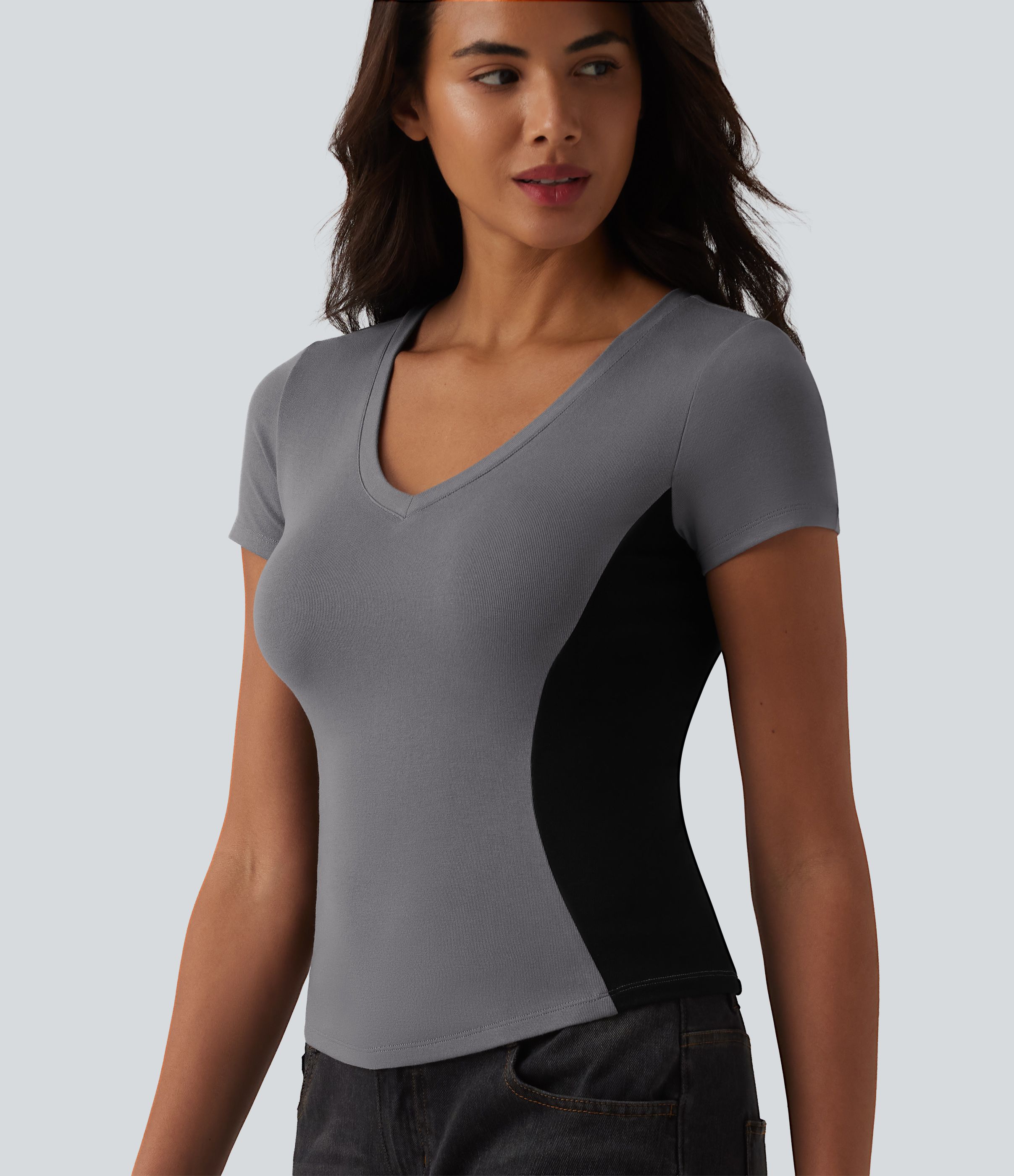 Ribbed Knit V-neck Short Sleeve Color Block Ultra-slim Casual T-Shirt