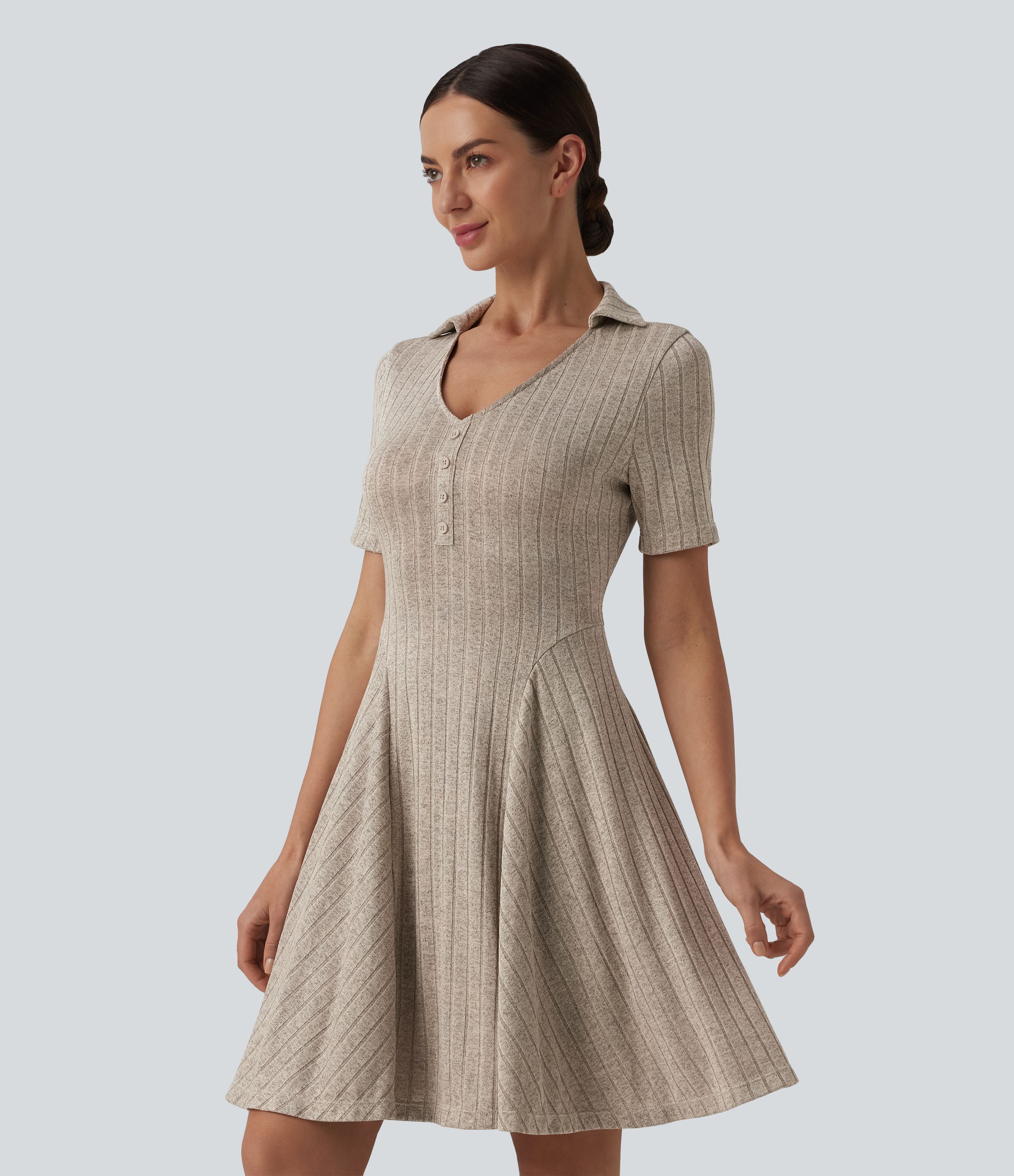 Ribbed Knit V-neck Short Sleeve Flare Mini Casual Dress
