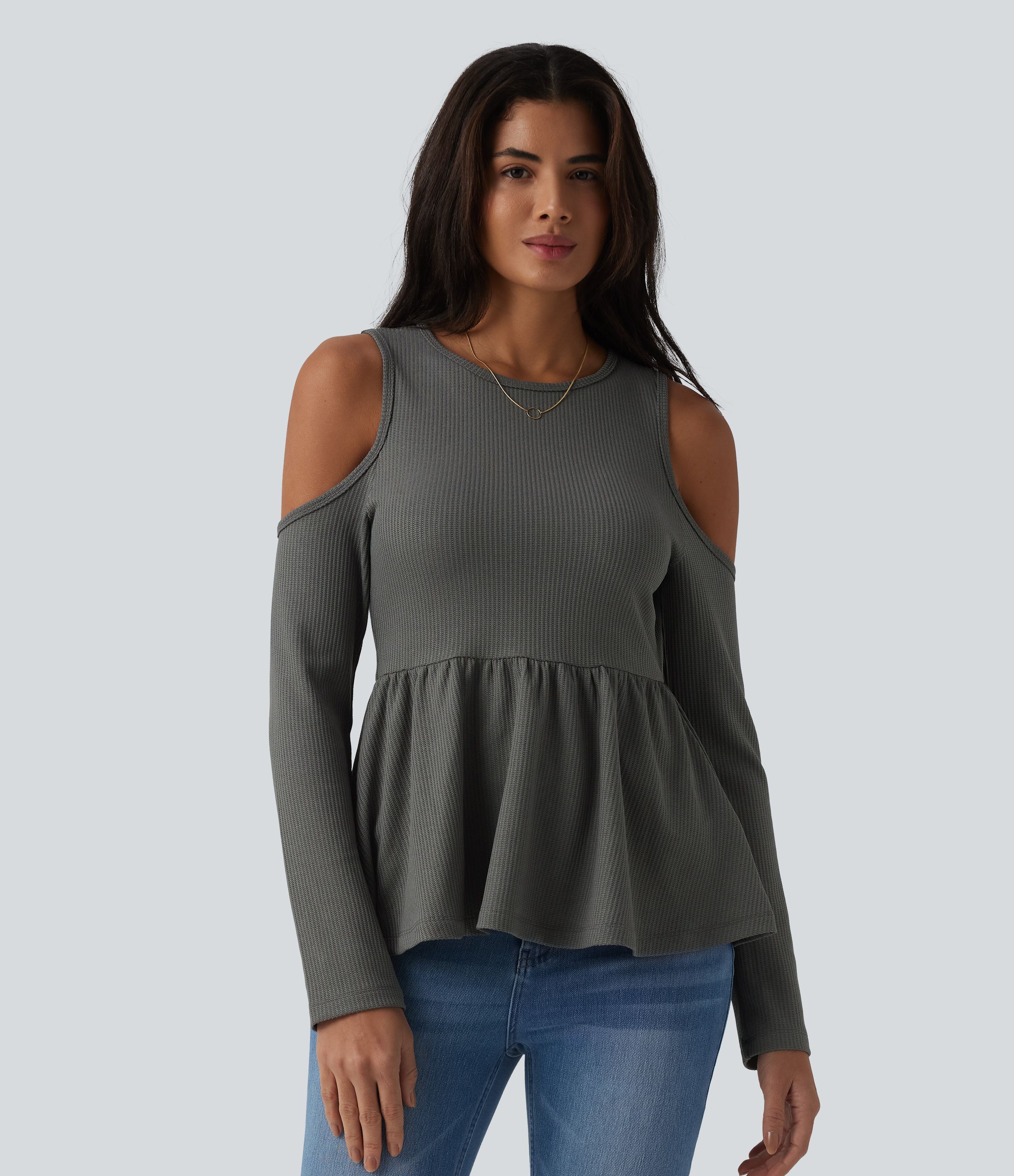 Round Neck Cut Out Long Sleeve Ruffle Hem Waffle Casual T-Shirt