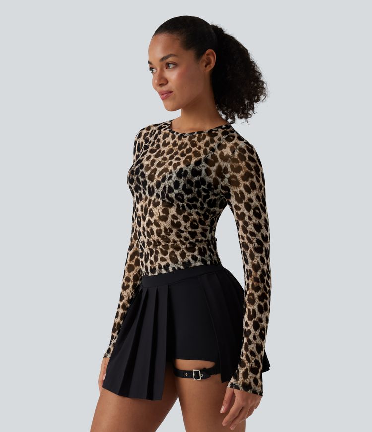 Round Neck Long Sleeve Leopard Print Sheer Mesh Casual Top