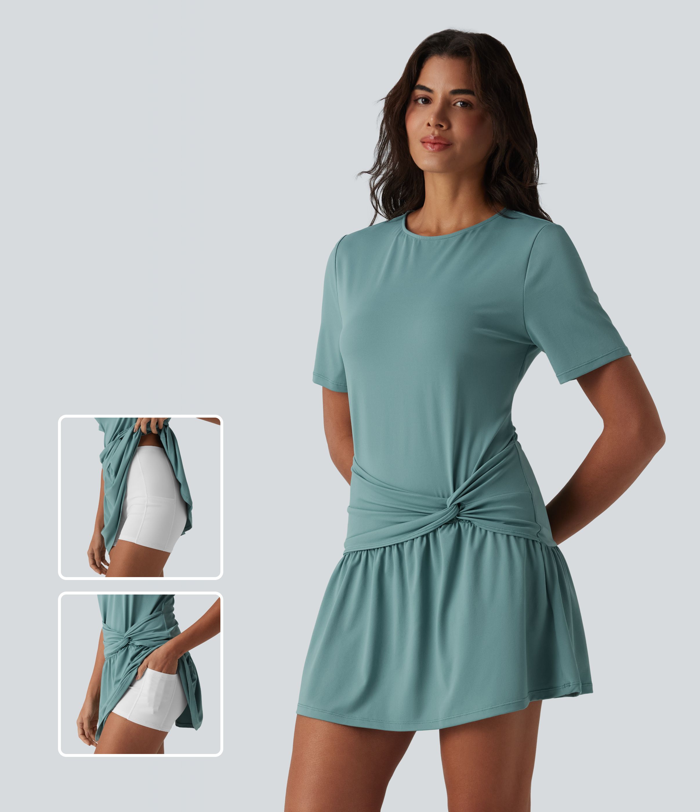 Round Neck Short Sleeve Keyhole Back 2-Piece Mini Casual Dress with Pockets