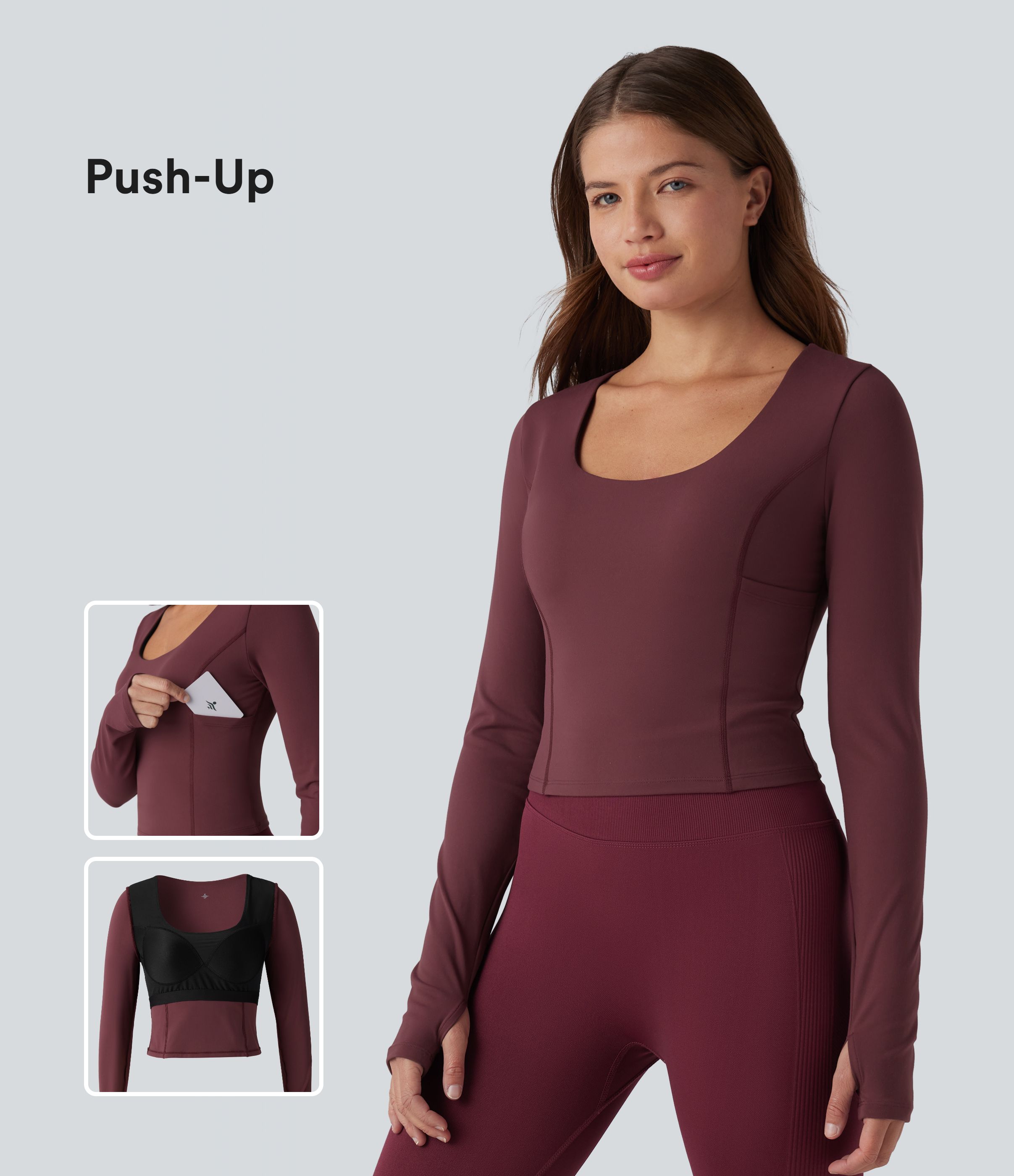 SoftlyZero™ Plush Scoop Neck Push-Up Long Sleeve Thumb Hole Yoga Sports Top with Pockets