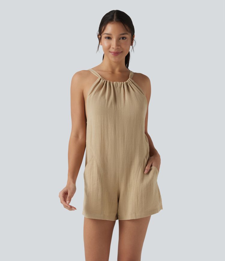 Tie Back Casual Linen-Feel Romper with Pockets