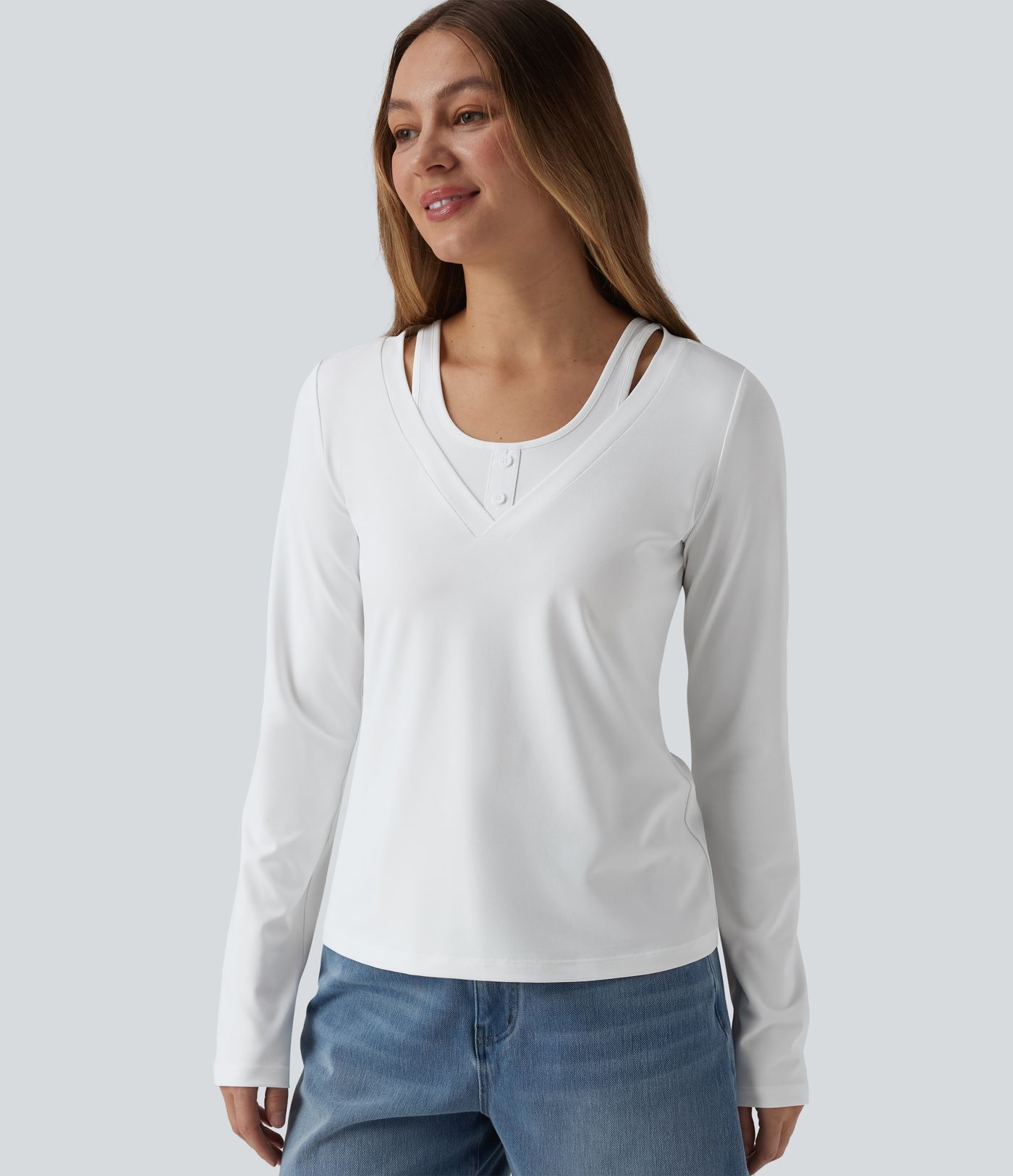 V Neck Long Sleeve 2-in-1 Casual T-Shirt