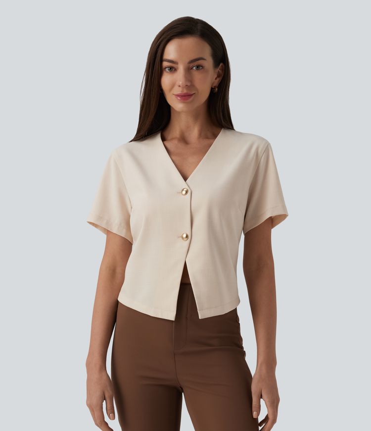 V Neck Short Sleeve Work Linen-Feel Blouse
