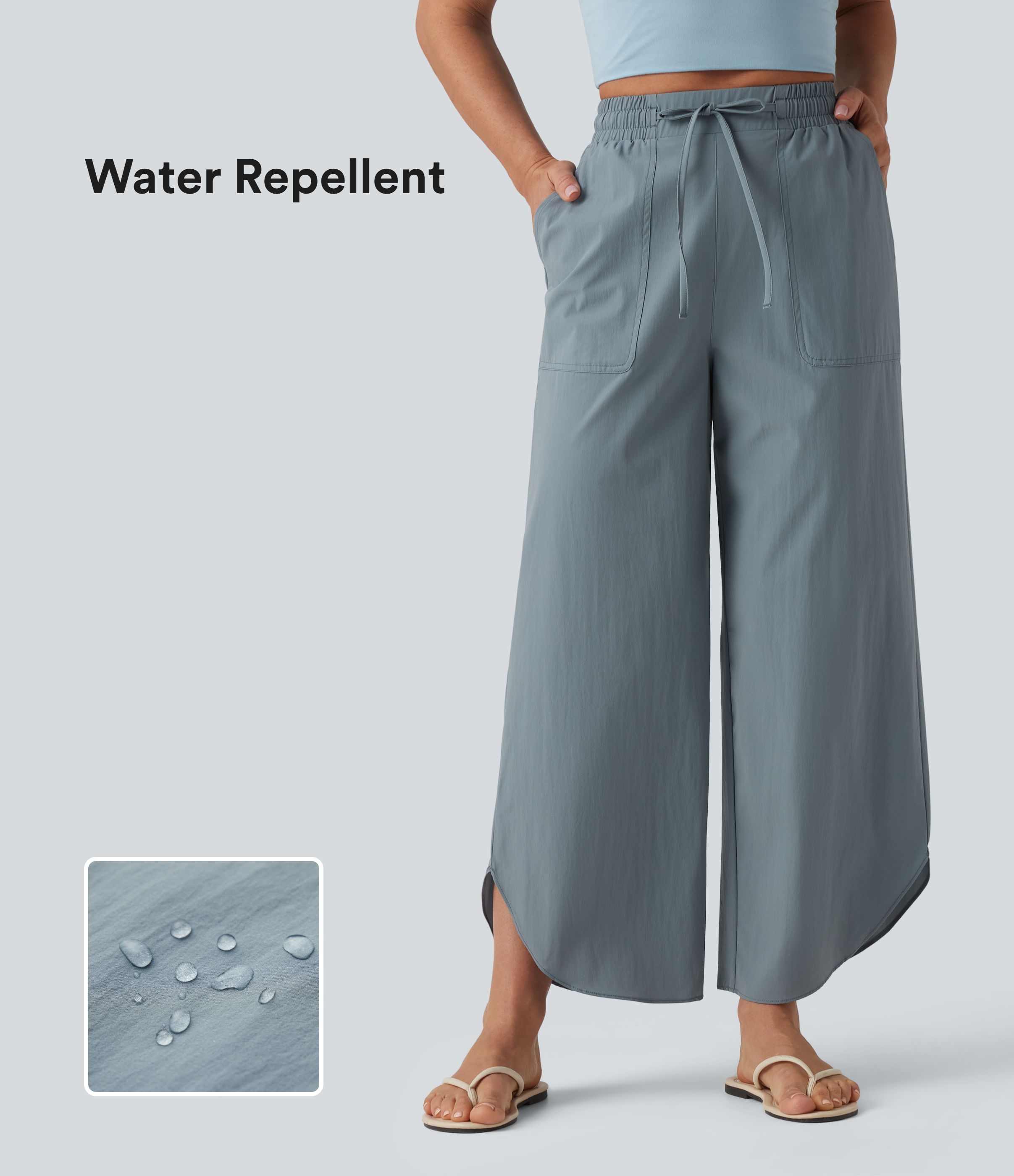 Water Repellent High Waisted Drawstring Wide Leg Curved Hem Casual Trousers with Pockets