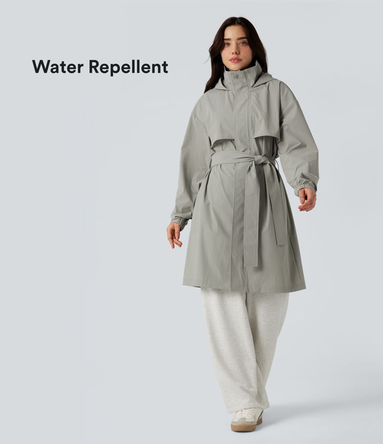 Water Repellent Hooded Belted Casual Trench Jacket with Pockets